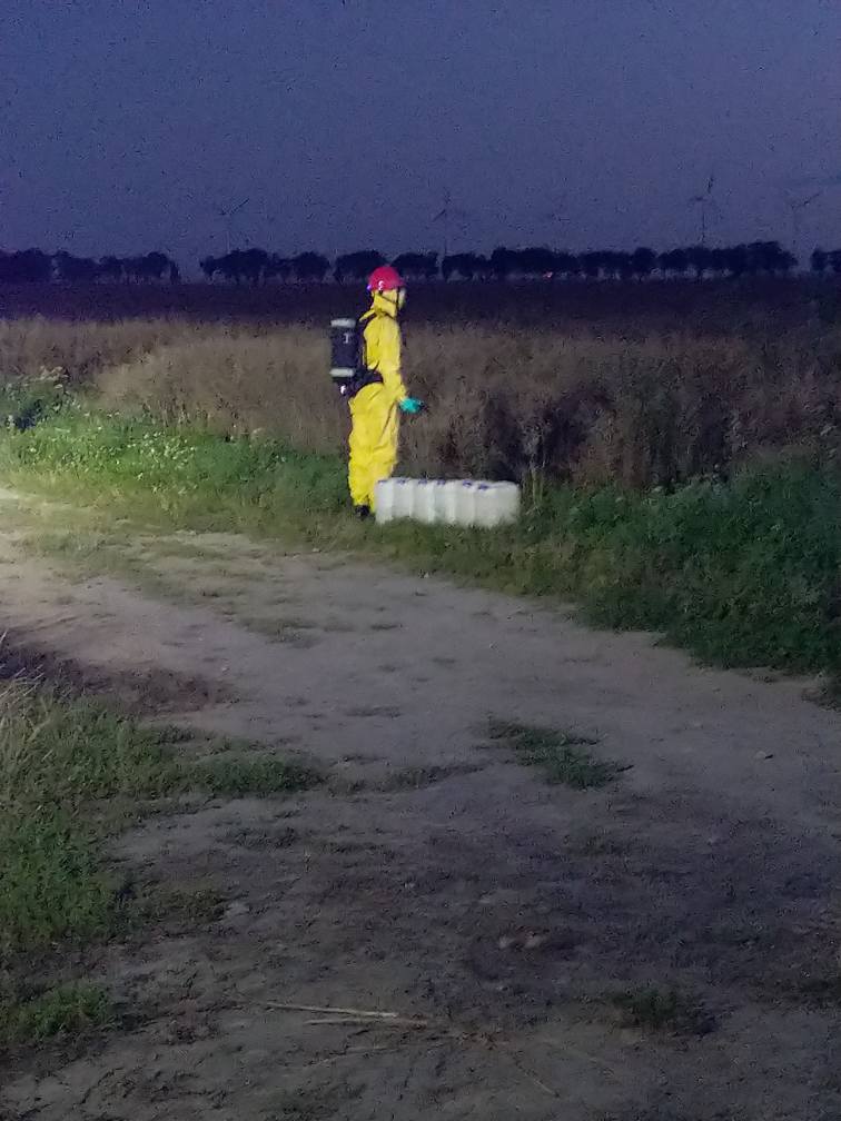 - O godzinie 19:38 otrzymaliśmy zgłoszenie o podejrzanych baniakach z nieznaną substancją - relacjonują strażacy z OSP Kolin. - Na miejsce natychmiast skierowano nasze jednostki, a także JRG Stargard, pluton chemiczny „Gryf” z JRG 2 Szczecin oraz policję. Dodatkowo konieczna była interwencja zespołu ratownictwa medycznego, ponieważ kobieta, która odkryła pojemniki, zasłabła i wymagała pomocy.