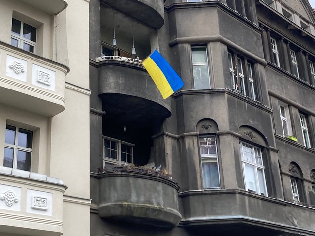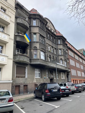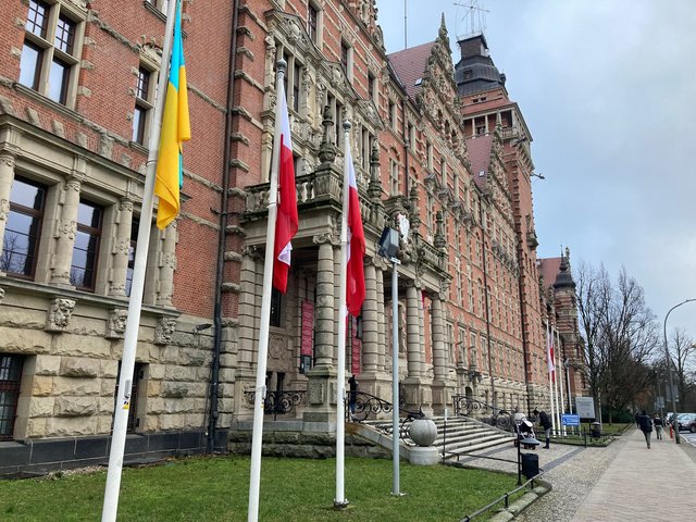 Od rozpoczęcia agresji Rosji na Ukrainę niebiesko-żółte flagi pojawiają się na budynkach w różnych miejscach Szczecina.
