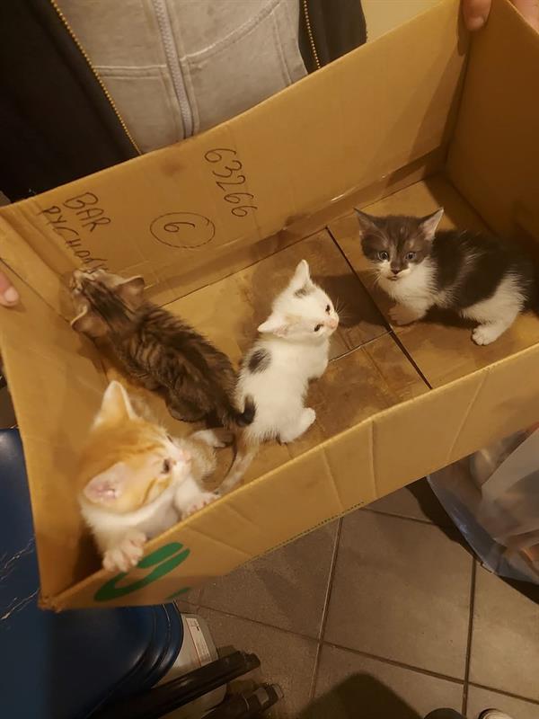 Maluszki mają około 5 tygodni. Są więc samodzielne. To dwie dziewczynki (tricolor z przewagą białego oraz szara) oraz dwaj chłopcy (rudo-biały oraz grafitowo-biały). Cierpią na koci katar, ale ich rokowania są bardzo dobre. Już zostały odpchlone i odrobaczone. Po leczeniu i zaszczepieniu będą mogły trafić w ręce czułych i odpowiedzialnych opiekunów.