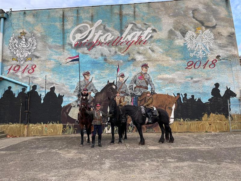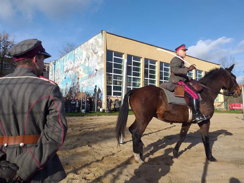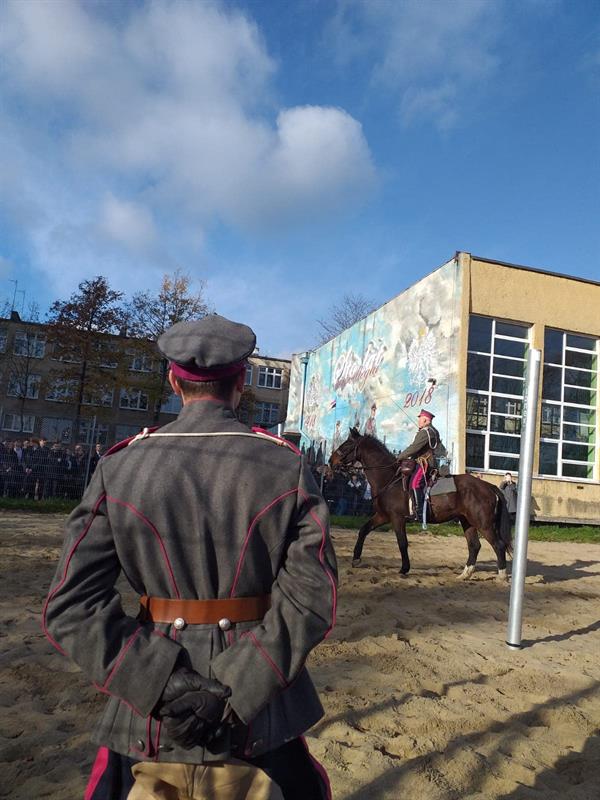 Przy wielkoformatowym muralu, który znajduje się na budynku szkoły, a przedstawiającym kawalerzystów 12 Pułku Ułanów Podolskich, młodzież szkolna wysłuchała opowieści o roli, jaką odegrała polska kawaleria w walce o niepodległość. Na własne oczy można było zobaczyć jak wygląda rząd kawaleryjski, mundur ułański i wyposażenie bojowe, jak lanca i szabla. Zainteresowanie wzbudziły również mundury Przysposobienia Wojskowego Kobiet jakie zaprezentowały na sobie członkinie Klubu Kawaleryjskiego. Ten wyjątkowy pokaz odbył się z inicjatywy Koła Żołnierzy 12 Pułku Ułanów Podolskich i Klubu Kawaleryjskiego im. 12 Pułku Ułanów Podolskich, organizacji ściśle współpracujących z 12 batalionem dowodzenia Ułanów Podolskich.
