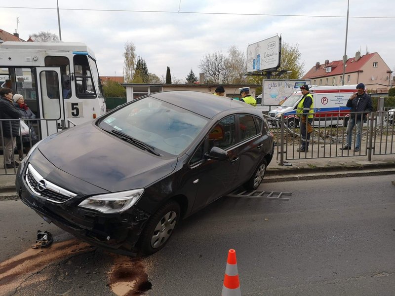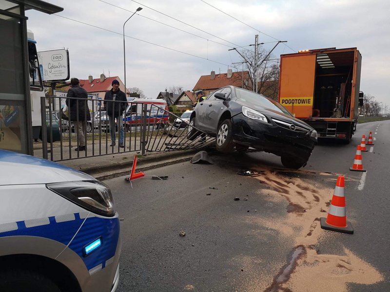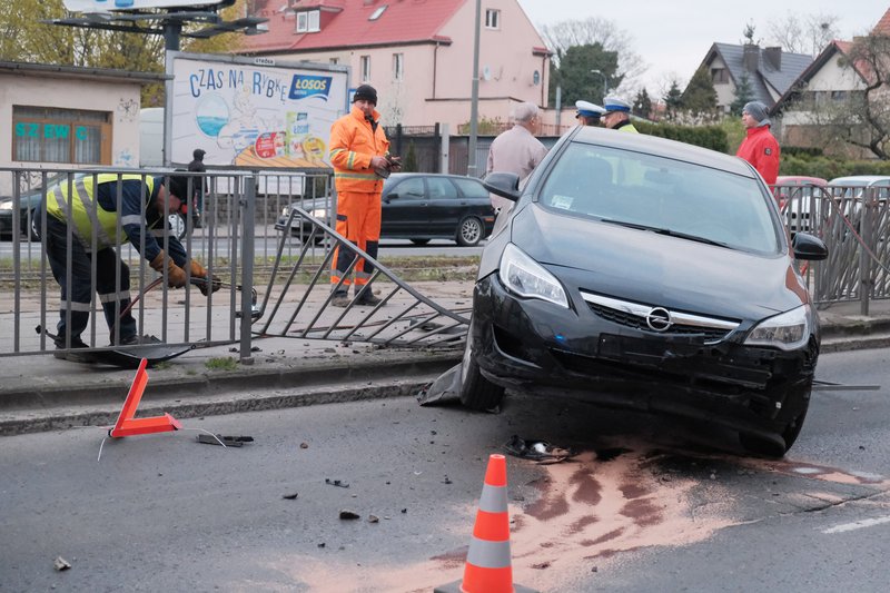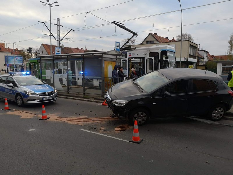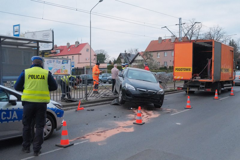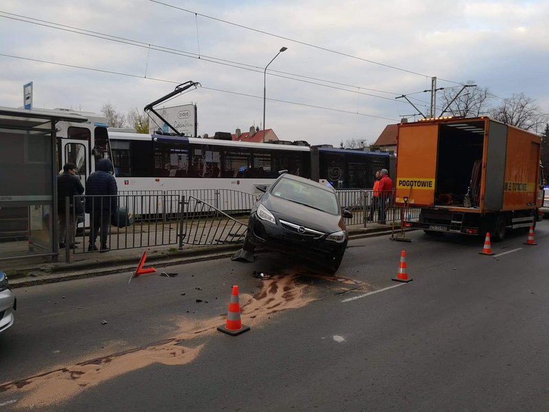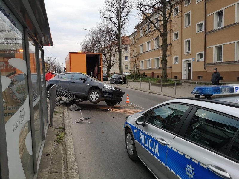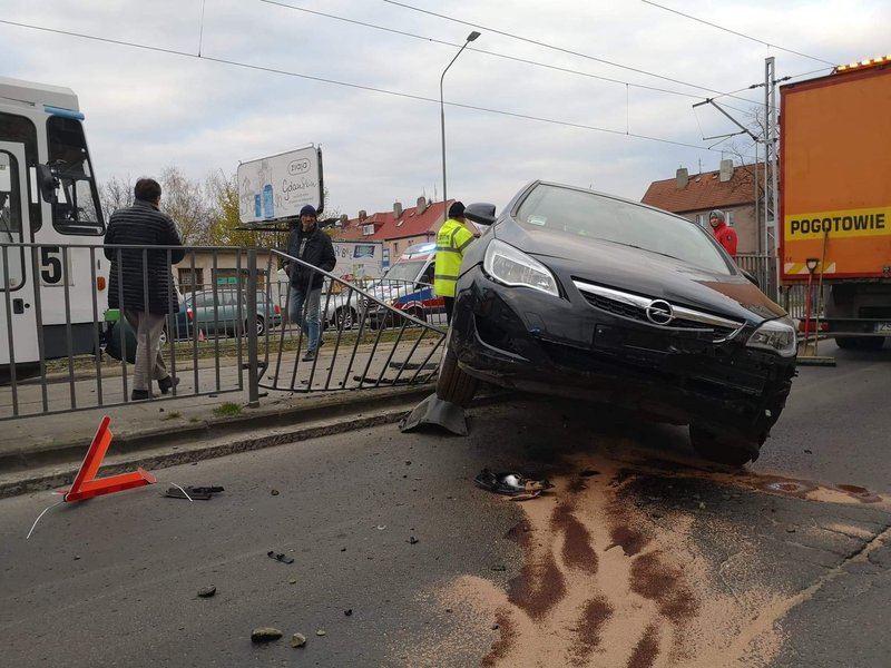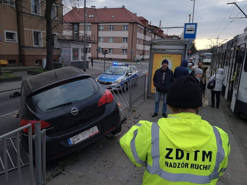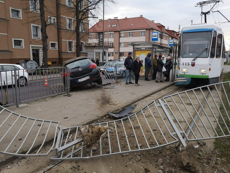 Siła uderzenia była tak duża, że opel zawisł na barierkach ochronnych przystanku tramwajowego. Na szczęście nikt nie został ranny.