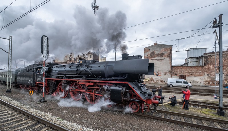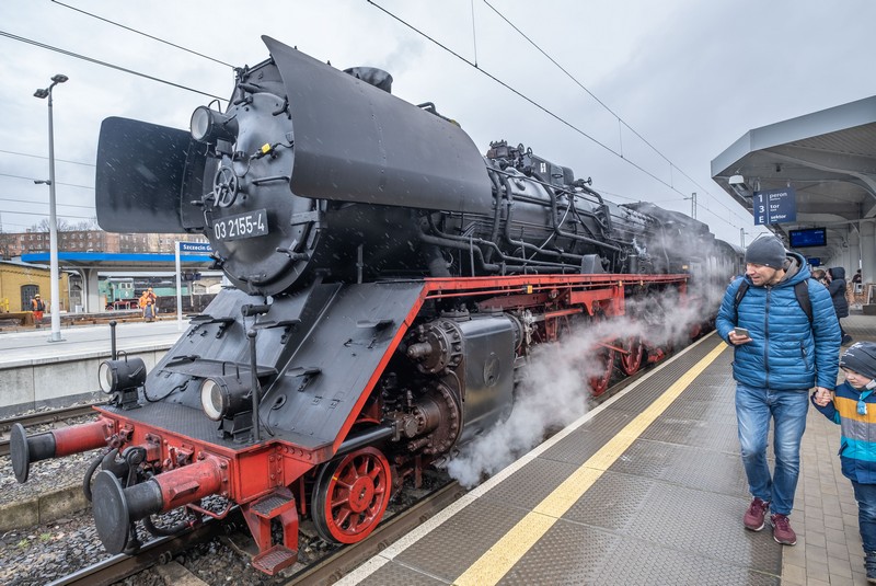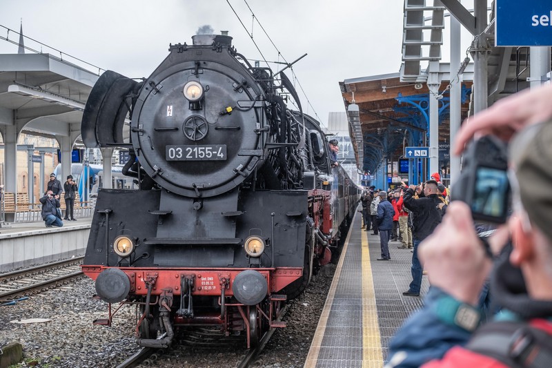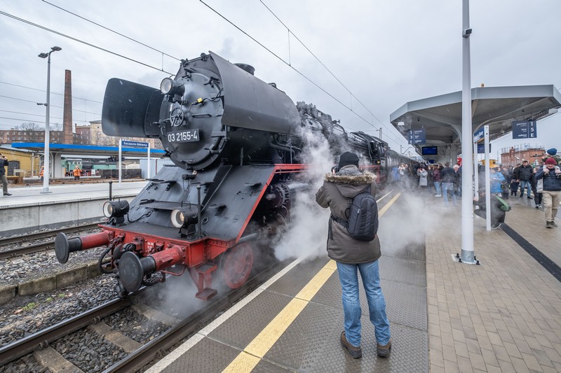 Po wymianie pasażerów w kłębach pary i z tradycyjnym gwizdem skład z zabytkowymi wagonami 1 i 2 klasy, ale także wagonem barowym, ciągnięty przez lekki parowóz pospieszny serii BR 3, wyruszył do Polic.