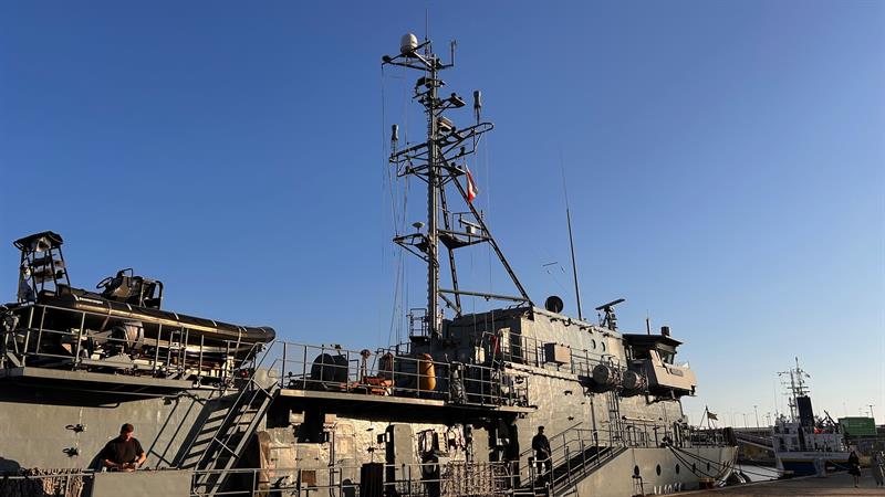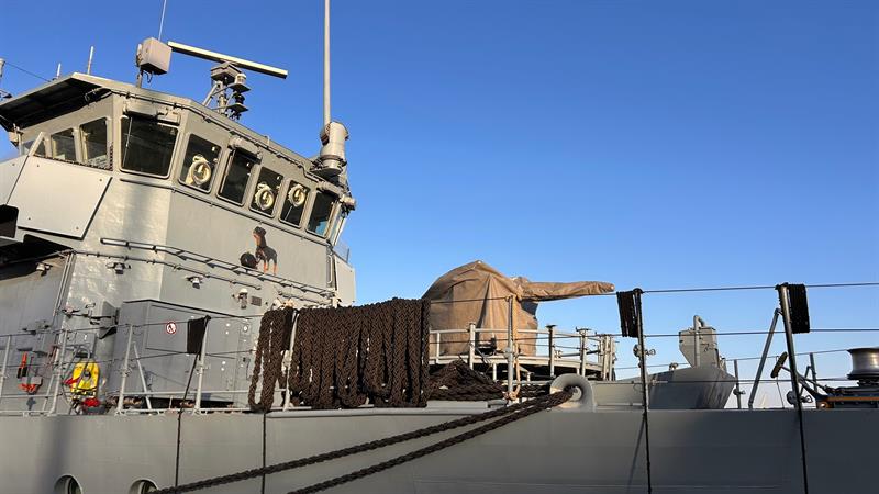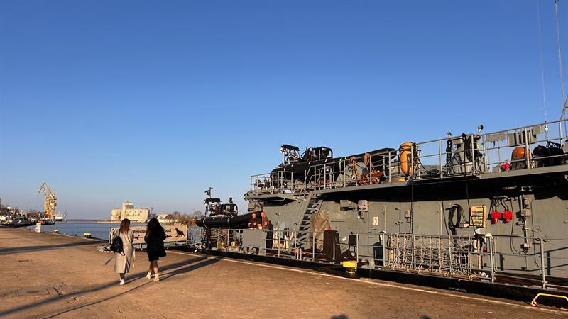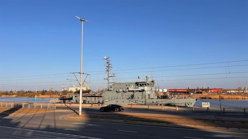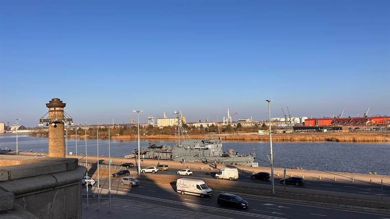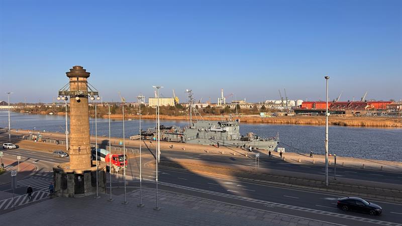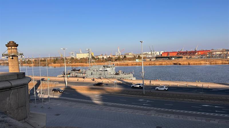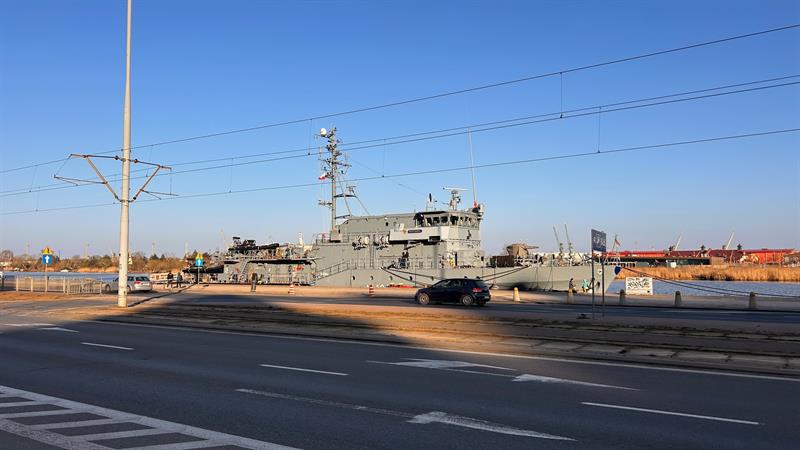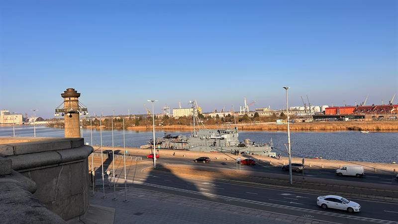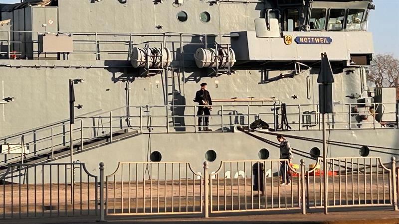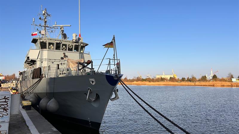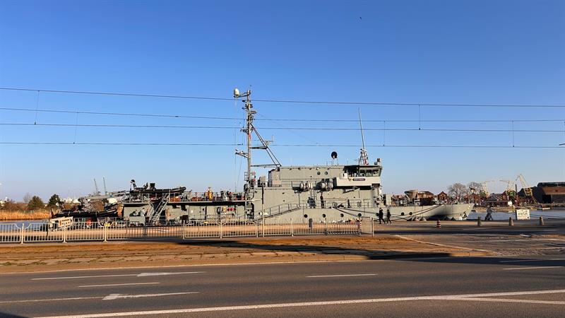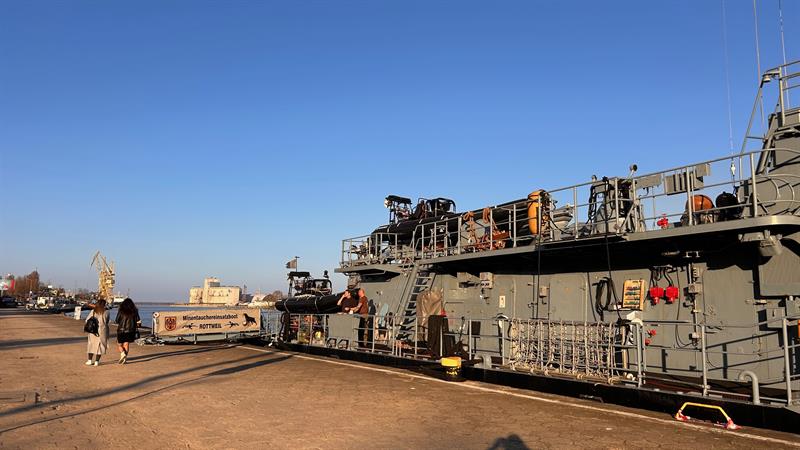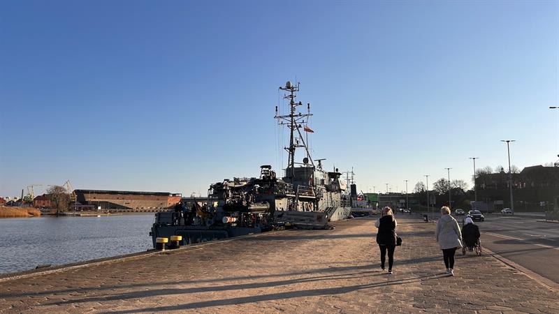 Niemiecki okręt wsparcia nurkowego FGS Rottweil cumuje w Szczecinie. Okręt obrony przeciwminowej można zobaczyć u stóp Wałów Chrobrego.