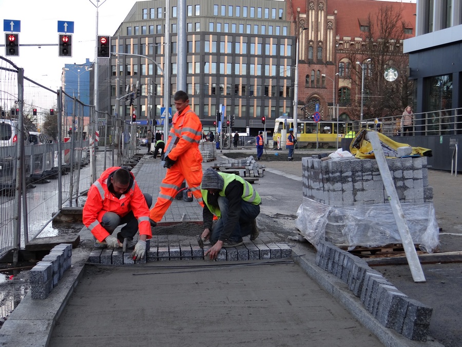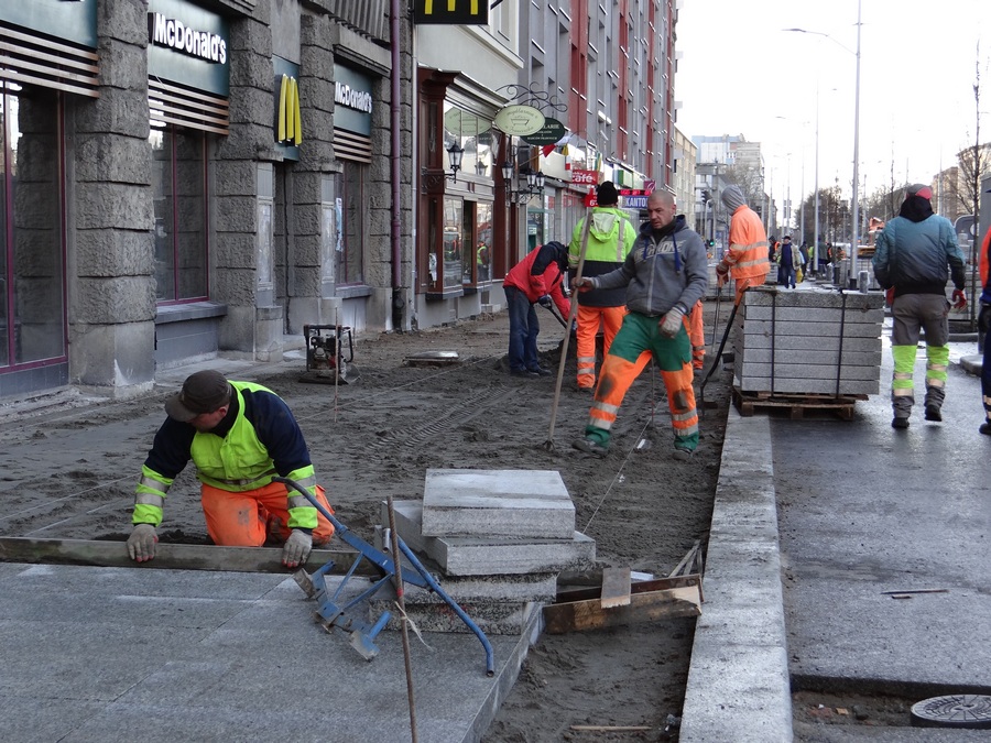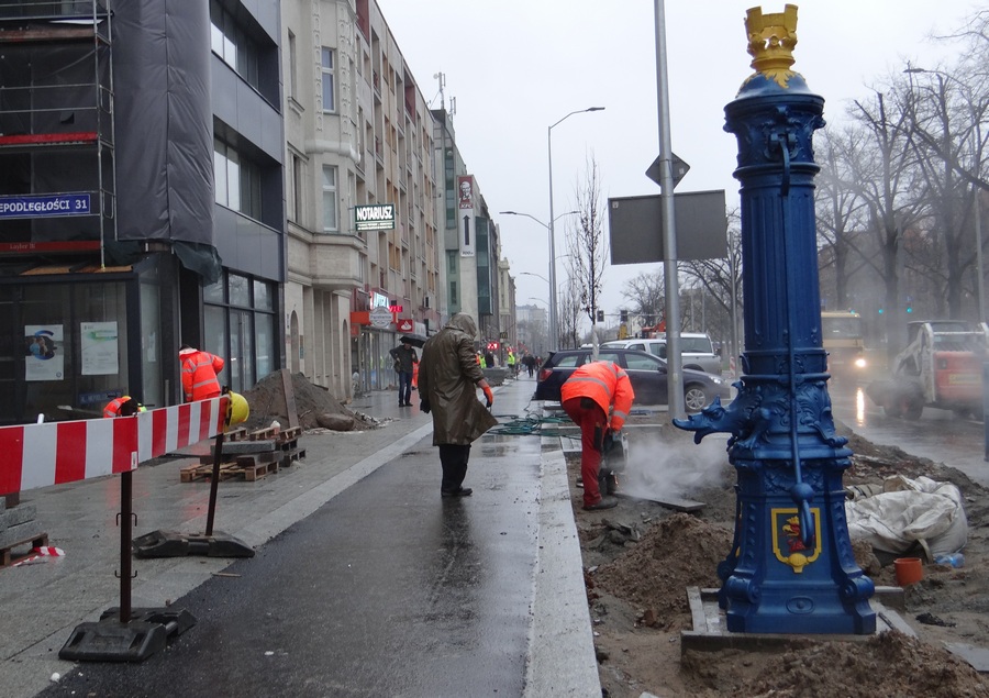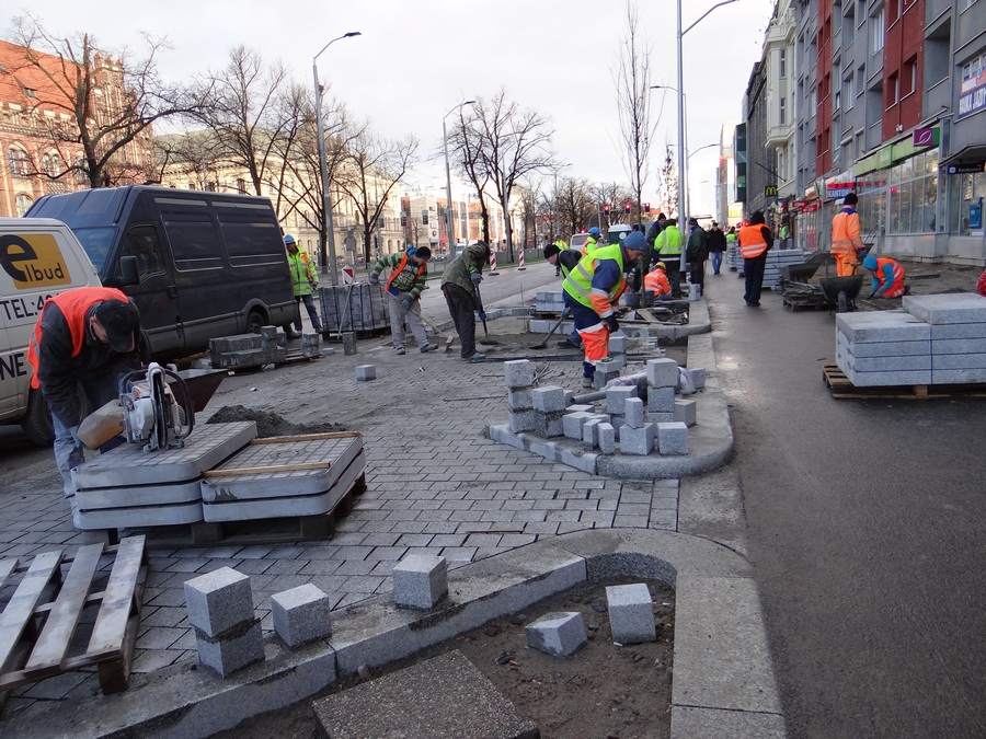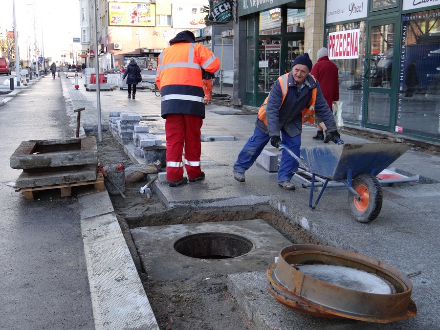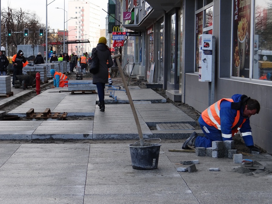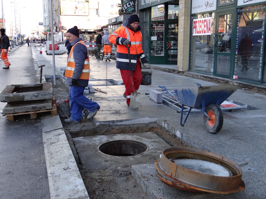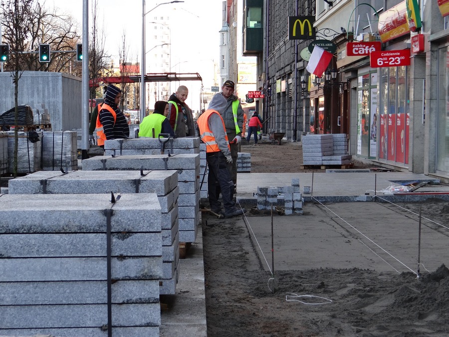 Natomiast trwają roboty brukarskie przy układaniu kostki w nowym pasie miejsc parkingowych oraz urządzanie chodnika, a przy okazji prace przy regulacji wysokości studzienek kanalizacyjnych. Likwidowana jest też większość samowolek przy wejściach do lokali użytkowych w parterach kamienic i budynków w postaci obskurnych schodków, wykraczających poza granice działek przynależnych do nieruchomości. Do czasu przebudowy ZDiTM tolerował ten stan rzeczy mimo że te „potworki" wchodziły w należący do gminy pas drogi publicznej.