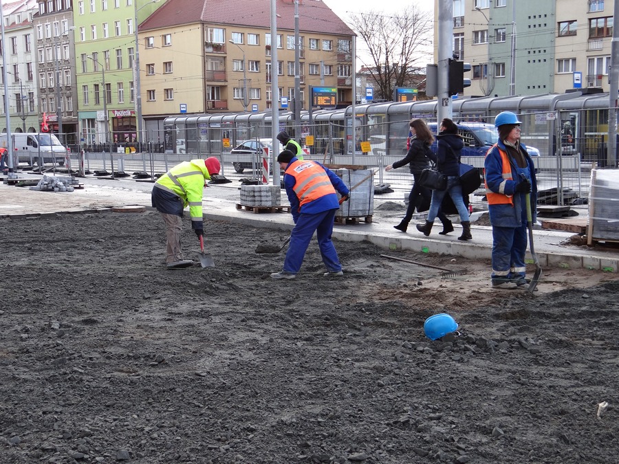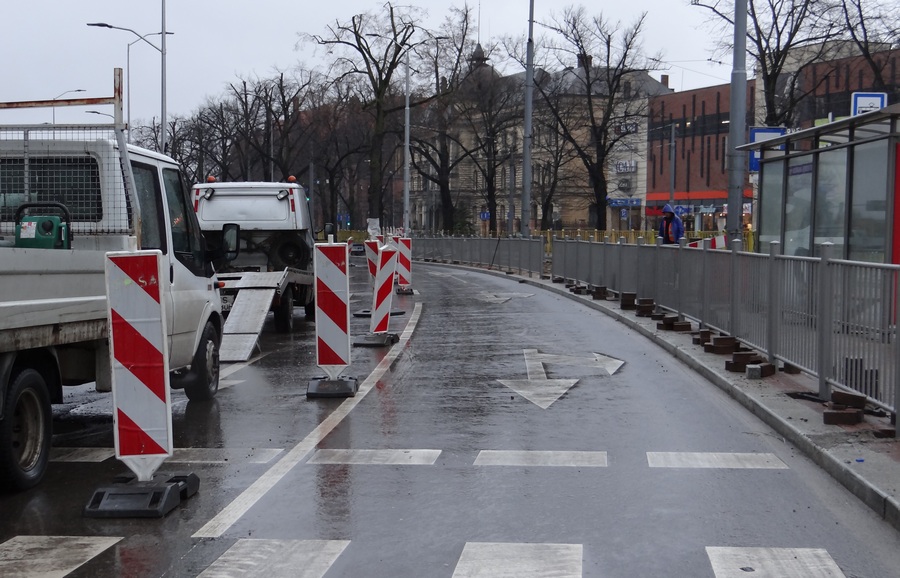 Postęp widać o tyle, że Energopol usunął wreszcie bariery, które zagradzały po jednym pasie do jazdy na wprost przez Bramę Portową do pl. Zwycięstwa i przez pl. Żołnierza Polskiego w kierunku Bramy Królewskiej i dalej Trasy Zamkowej dla aut, które wyjeżdżają z ul. Obrońców Stalingradu. Zwężenia zniknęły.