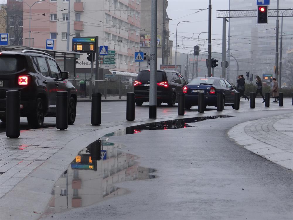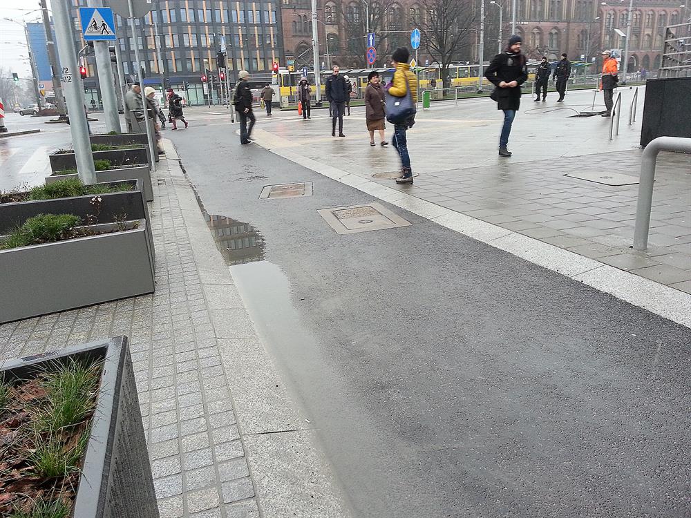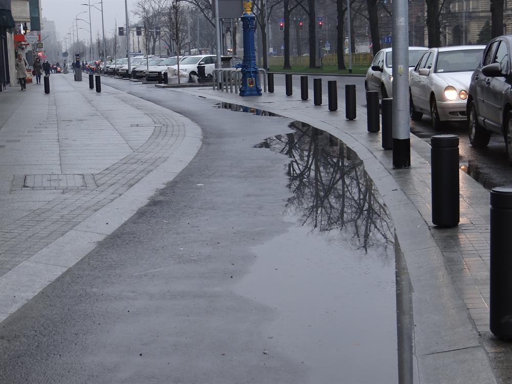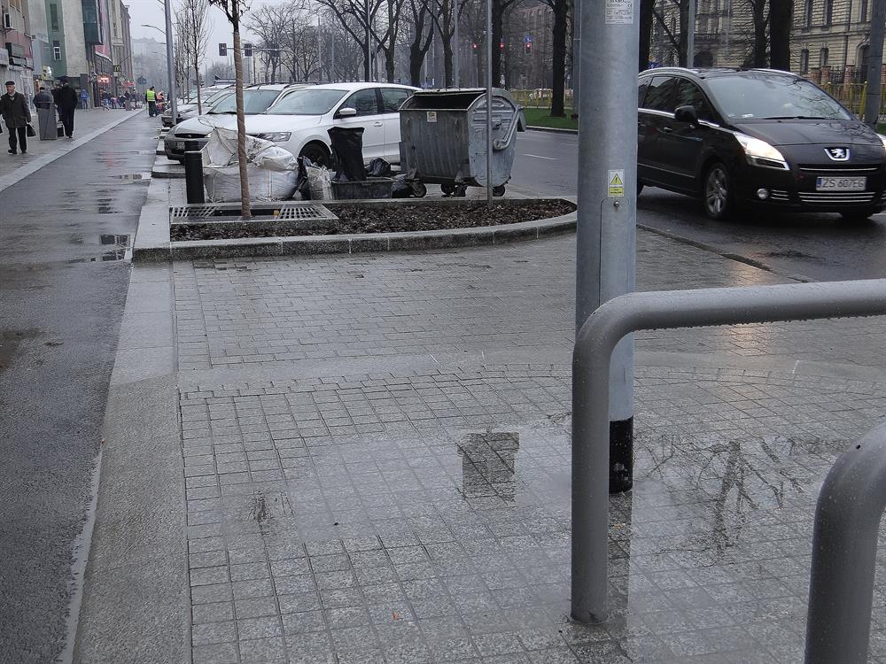 I na tym najnowszym z dzieł Energopolu w alei w centrum, odebranym i oddanym do użytku przez ZDiTM, kałuż i zastoin deszczówki również bez liku. Na pasie asfaltowej ścieżki rowerowej tuż przy ustawionych donicach z zielenią przy jezdni na wysokości biurowca przy prawoskręcie w al. Niepodległości począwszy.