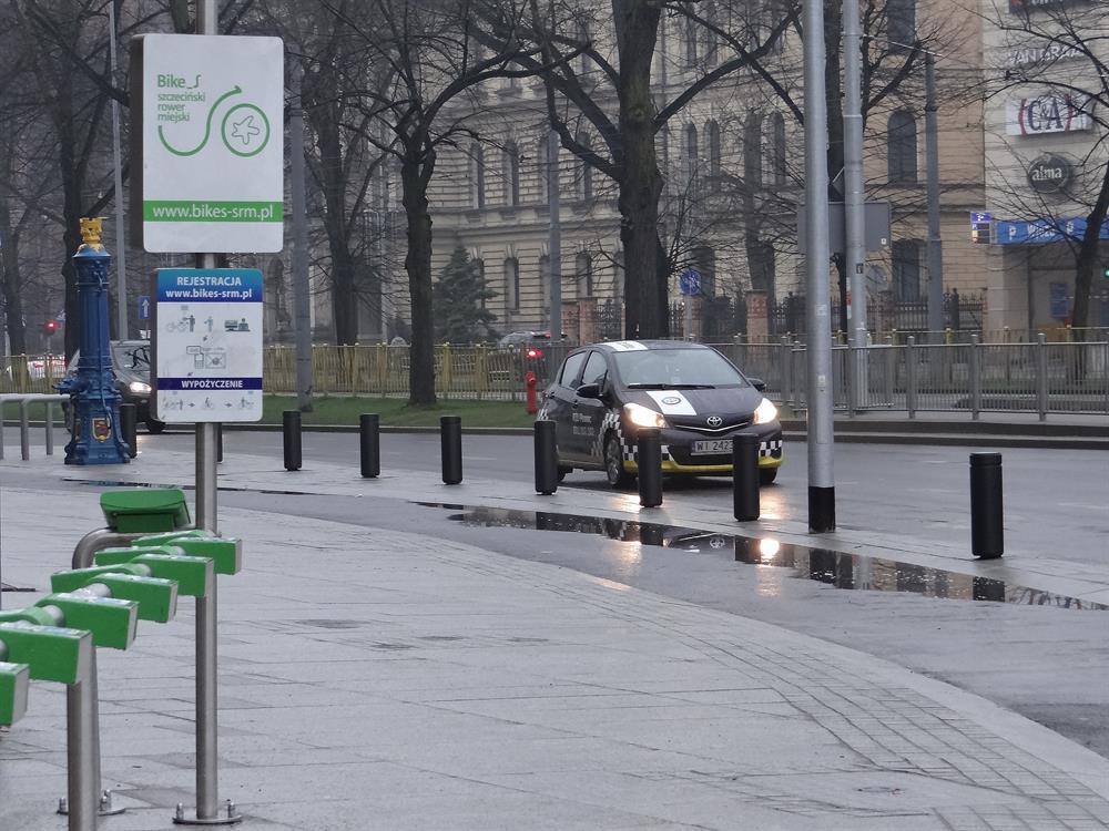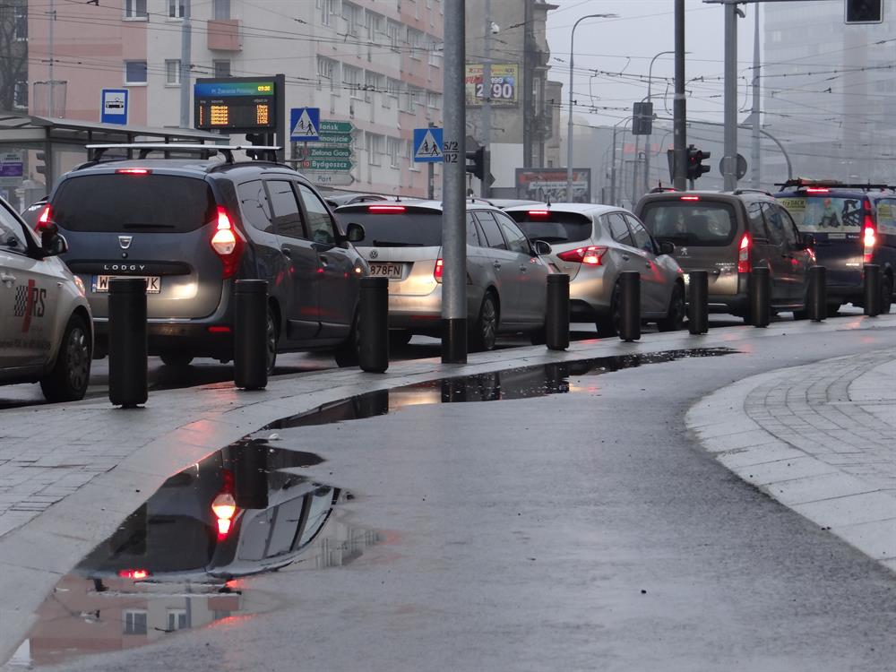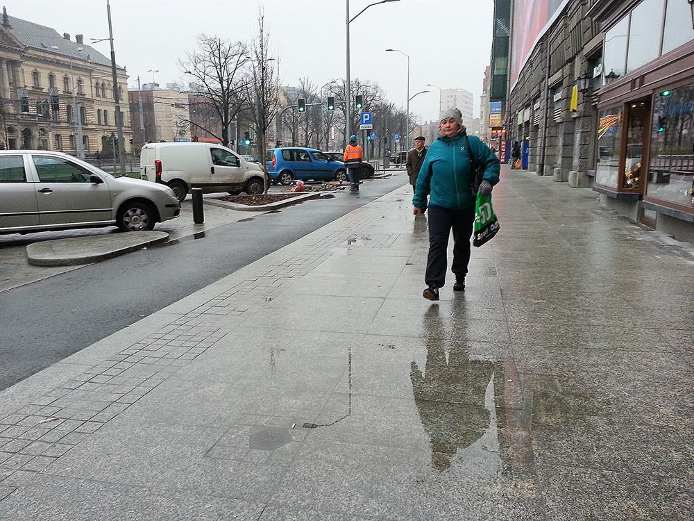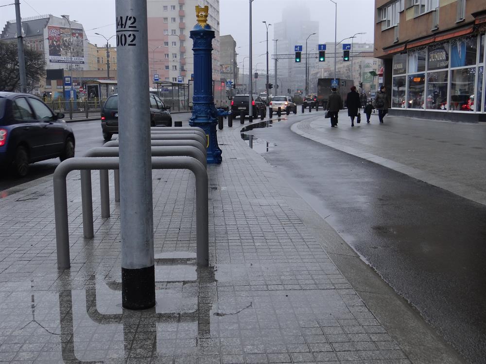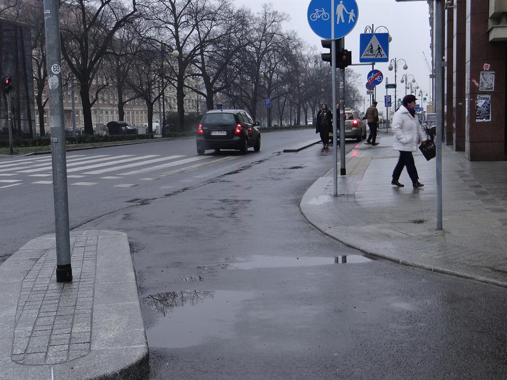 I na tym najnowszym z dzieł Energopolu w alei w centrum, odebranym i oddanym do użytku przez ZDiTM, kałuż i zastoin deszczówki również bez liku. Na pasie asfaltowej ścieżki rowerowej tuż przy ustawionych donicach z zielenią przy jezdni na wysokości biurowca przy prawoskręcie w al. Niepodległości począwszy.