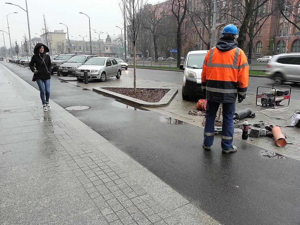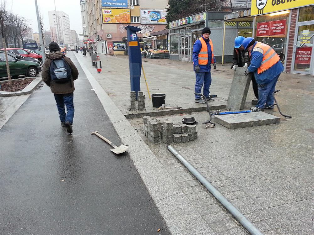 Zaczęło się od czynności najprostszych, czyli uzupełnienia na poboczach oznakowania - dopiero w poniedziałek dostawione zostały na nich np. tablice informujące, że to strefa płatnego postoju, choć parkomaty w alei funkcjonowały już dużo wcześniej. Od wtorku trwa usuwanie niedoróbek, w tym nierówności, w ułożonym z płyt chodniku, przy studzienkach i przekładanie fragmentów wyłożonych kostką brukową. Trwały również „prace artystyczne" przy wypełnianiu szczelin między płytami i krawężnikami wokół klombów z drzewkami.