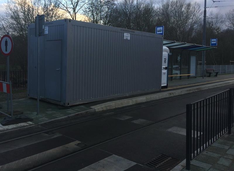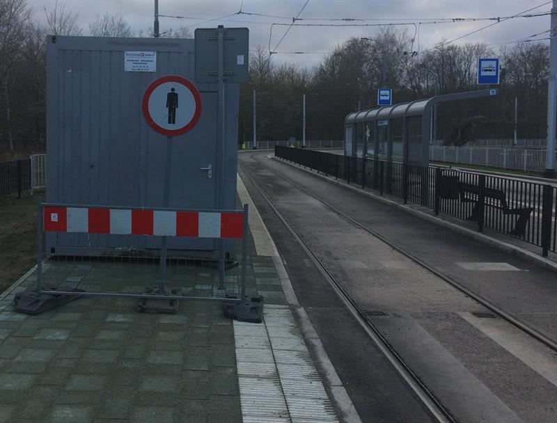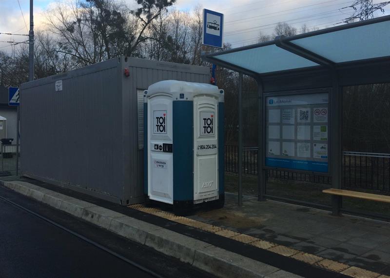 Przenośna toaleta została ustawiona przy przystanku. Tyle że drzwiami otwierającymi się na torowisko. Wejść do takiego „pudełka" łatwo lecz wyjść… Z tej opresji jest już gorzej.