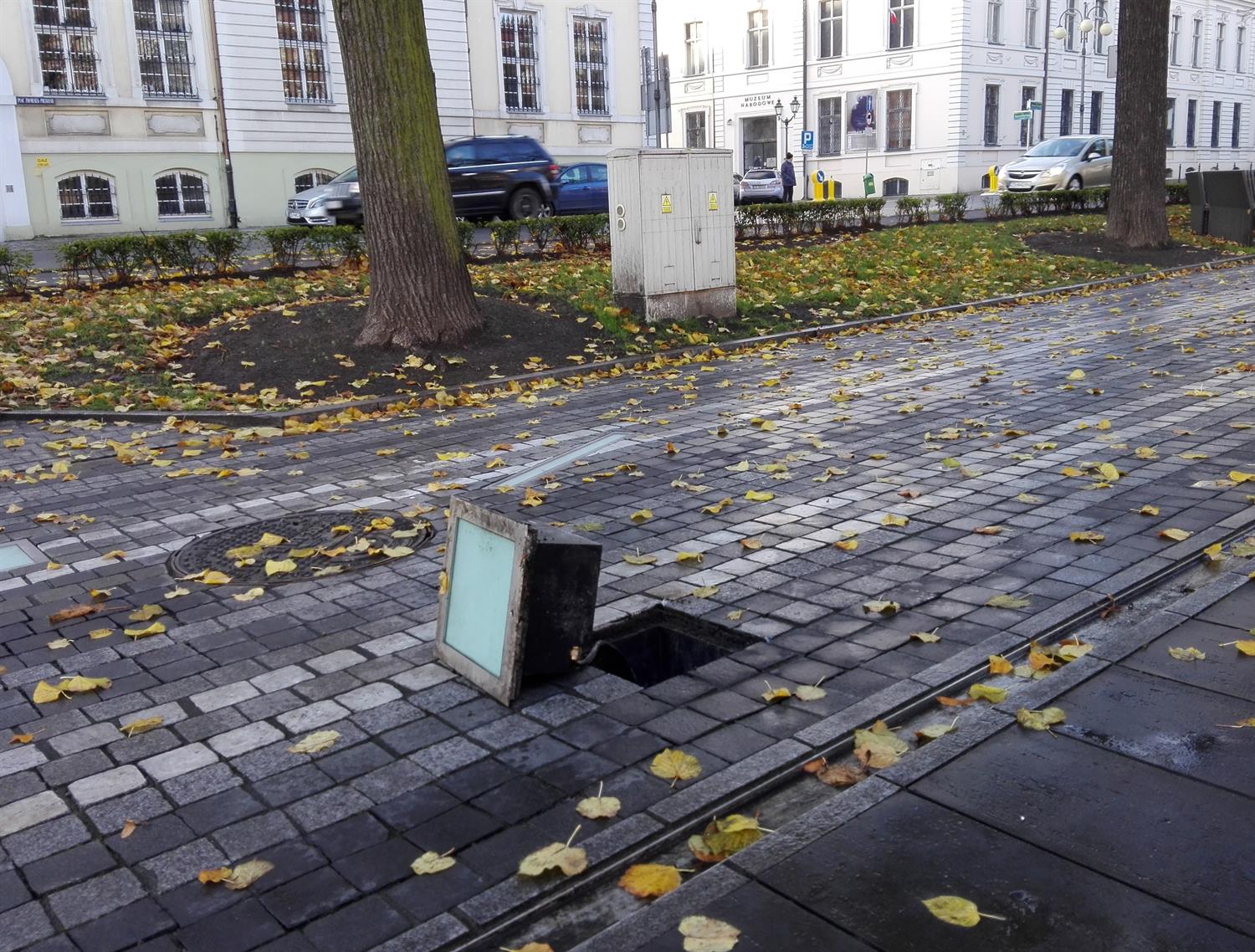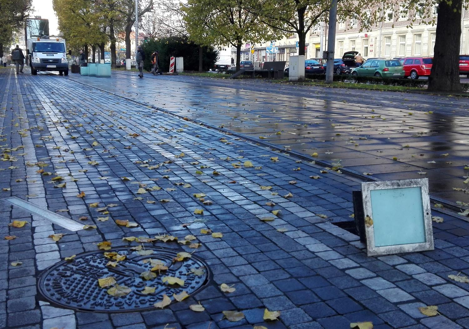 Gdy jedni naprawiają „szklaną pułapkę", to inni usuwają usterki w nawierzchni: wymieniają płytki, odnawiają świecące kubiki lub - jak teraz - po raz „enty" zgłębiają tajemnicę naziemnych reflektorów. Inwestycja za 8 milionów złotych, a ciągle wymaga jakiejś poprawki, bo usterka goni następną usterkę, awarię, a niejako przy okazji ujawniają się kolejne budowlane niedoróbki.