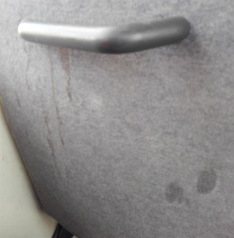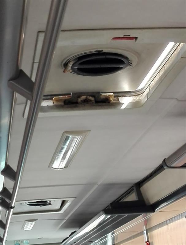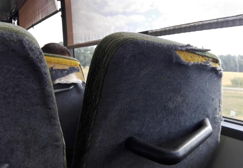 Wnętrze cuchnęło. Oparcia miejsc pasażerskich były potwornie brudne: odrażająco poplamione, podziurawione, sprawiały wrażenie nigdy nie pranych. Materiał trzymał się na nich - powiedziałabym - umownie. Bo za pomocą ordynarnie wbitych zszywek tapicerskich, a nawet pinezek (patrz zdjęcia). Niektóre ze zszywek dyndały ostrą stroną w stronę pasażerów siedzących na dalszych fotelach. Co nie wróżyło dobrze np. przy ostrym hamowaniu. Szczęście, że nie jechały dzieci, więc na trasie nikt się nie poranił. Natomiast tam, gdzie materiał - mimo pinezek i zszywek - się nie trzymał foteli, widać było resztki pożółkłej i porwanej gąbki. Nie było mowy, by się dotknąć takiego syfu.