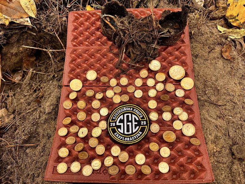 Niecodziennego odkrycia członkowie stowarzyszenia dokonali w niedzielę, 5 listopada w okolicach Szczecina-Płoni. W zakopanej pod starym drzewem puszce znaleźli 70 monet - wśród nich carskie ruble o nominałach 5 i 15 oraz dolary amerykańskie o nominałach 5,10 i 20. Monety pochodzą z końca XIX wieku i początku wieku XX. Najmłodsza z nich datowana jest na rok 1926. Najstarsze z kolei na rok 1880 i 1897. Pierwsza to pięciodolarówka, druga - pięć rubli. Dodatkowo, jak dowiadujemy się od członków grupy, jest to złoto próby 900 i o wadze 404 gramów.