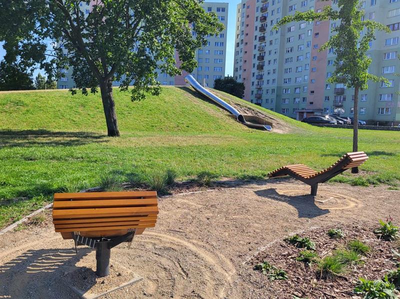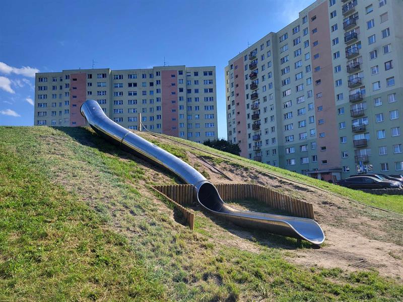 Ze szczytu górki można teraz zjechać specjalną rurą, która ma prawie 13 metrów długości. Dookoła rozłożono gumowe maty zabezpieczające, po których można również wdrapać się na górę. W pobliżu pojawiły się cztery obrotowe leżaki z dojściem z nawierzchni mineralnej. Są też nowe ozdobne nasadzenia.