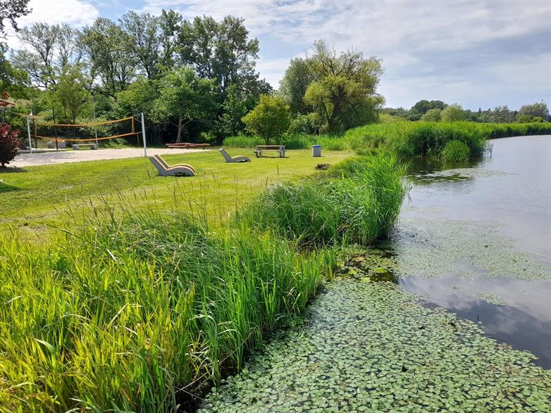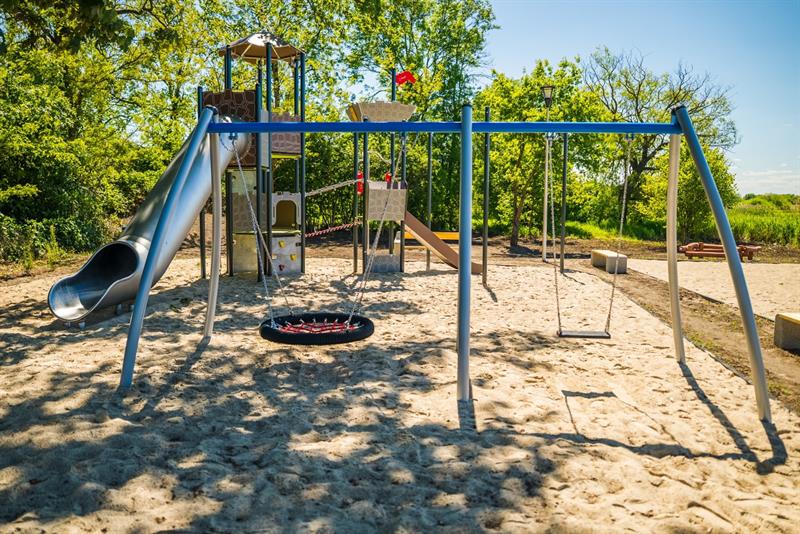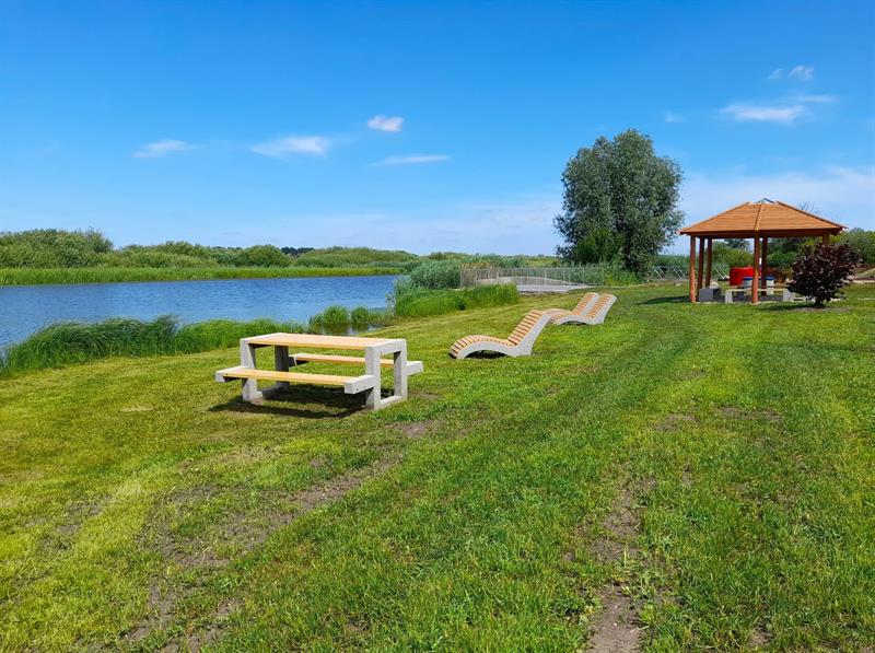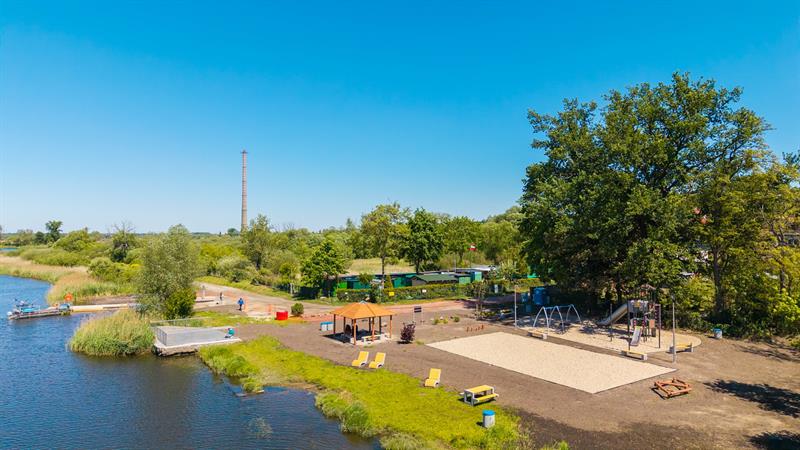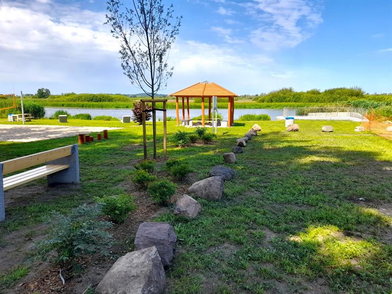 Teren, który wcześniej był zaniedbany, przeszedł gruntowną modernizację. Powstał tu plac zabaw wyposażony w różnorodne urządzenia, w tym drewniane elementy do wspinania, huśtawki oraz wielofunkcyjne zestawy zabawowe. W bezpośrednim sąsiedztwie ustawiono wiatę z miejscem na ognisko, ławki, stół piknikowy oraz leżaki. Całość uzupełniają kosze na śmieci i latarnie parkowe, które zapewniają oświetlenie po zmroku. Dla osób szukających aktywnego wypoczynku przygotowano boisko do gry w piłkę plażową oraz miejsce do odpoczynku na trawie.