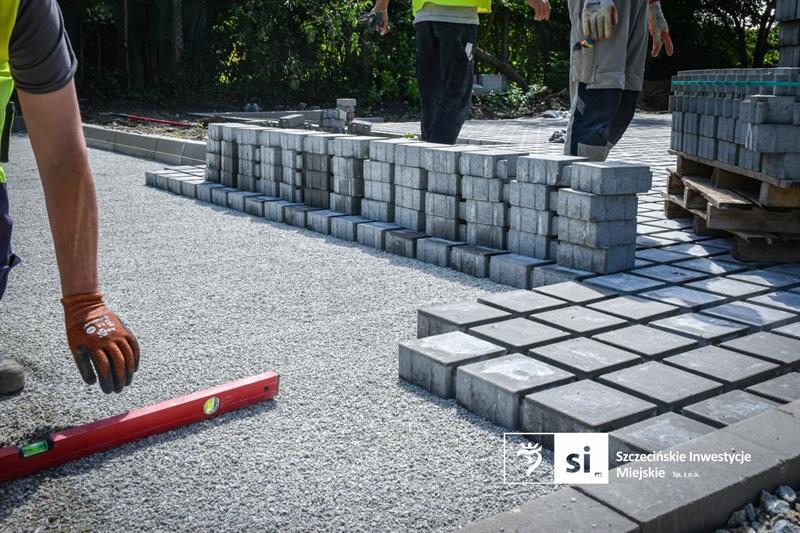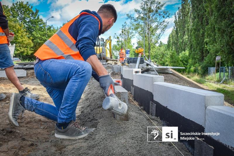 Roboty obejmują m.in. przygotowanie podłoża pod nawierzchnie, układanie kostki brukowej, montaż krawężników oraz budowę muru oporowego. Wzdłuż planowanej trasy wykonawca wzmacnia skarpę, na której będzie chodnik i droga rowerowa. W niektórych miejscach prowadzone są prace ziemne i układane są kolejne warstwy podbudowy. W innych – trwa montaż nawierzchni i elementów wykończeniowych.
