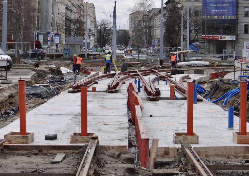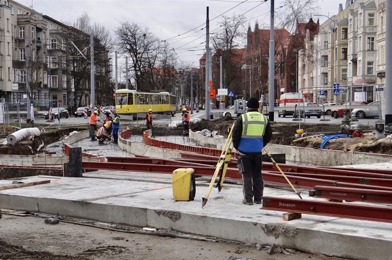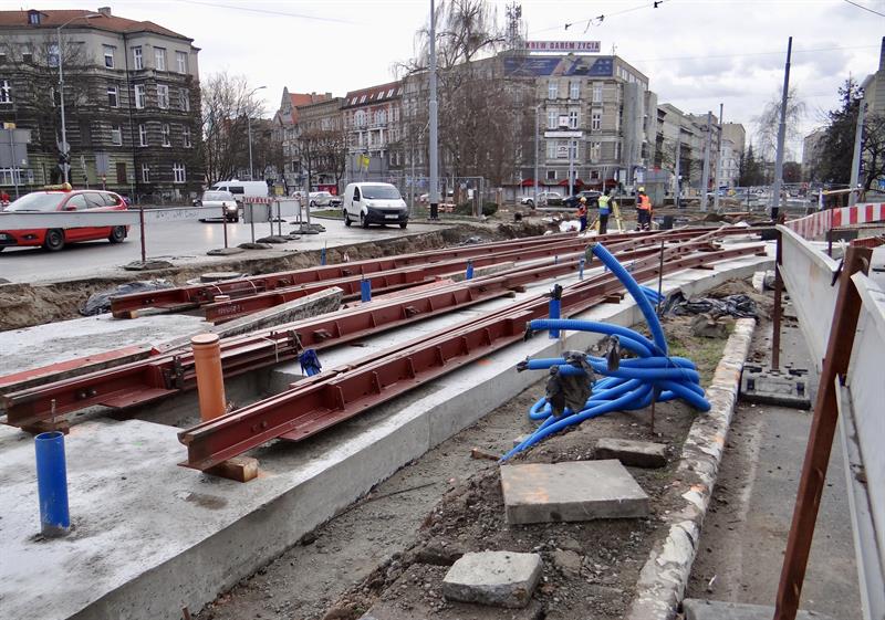 W wydzielonej pod plac przebudowy części wyspy centralnej samego pl. Szarych Szeregów i jezdni zablokowanym dla ruchu samochodów w miejscu, gdzie jezdnię przecina pas torowiska od strony al. Wojska Polskiego, po przygotowaniu podłoża w wykopie i ułożeniu instalacji, m.in. nowych rur systemu odprowadzania ścieków do kanalizacji i instalacji teletechnicznych, od końca minionego tygodnia prowadzone są prace przy wylewaniu nowej warstwy betonowych podbudów, na których następnie osadzane będą szyny i rozjazdy. Te, które do tej pory zostały dowiezione na plac przebudowy, zdążyły już trafić na swoje docelowe miejsca. Krok po kroku drogowcy przygotowują jednocześnie szalunki przed wylewaniem betonu pod dalsze fragmenty podbudów nowych torów. ©℗