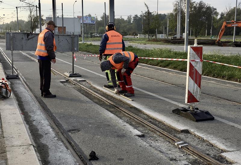 Na zdjęciu: Rejon pętli na Basenie Górniczym. Kolejna z serii napraw nowych torów tramwajowych w toku. Nowe wstawki w miejscach pęknięć wykonuje spółka Stanled.