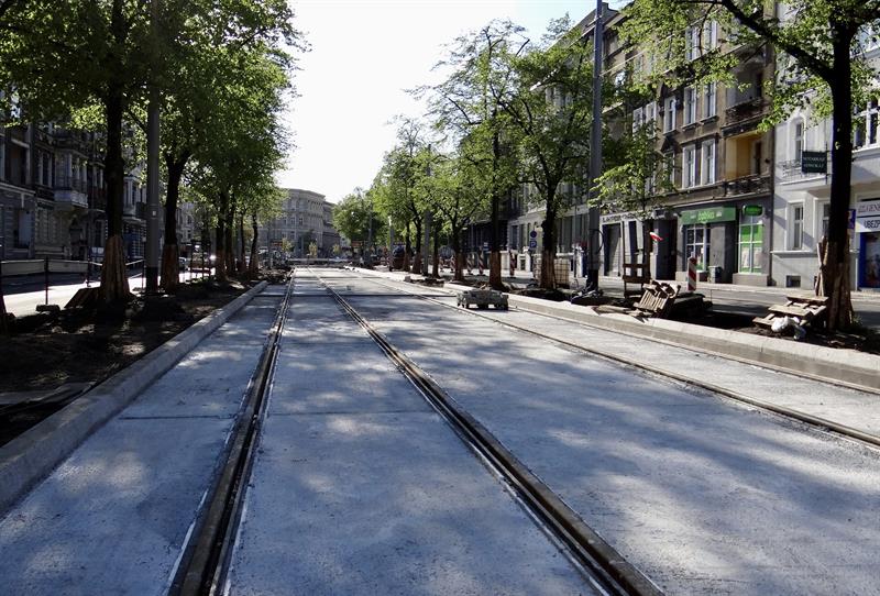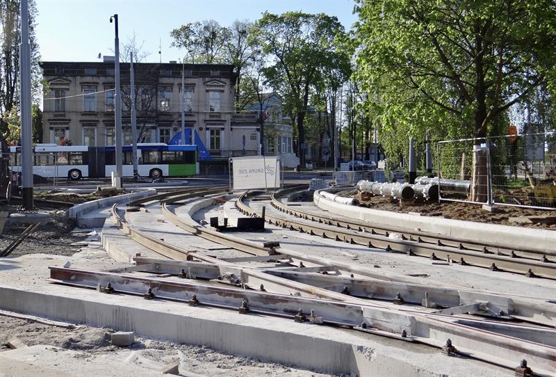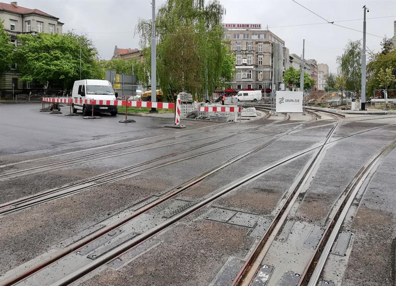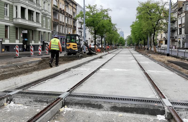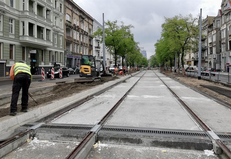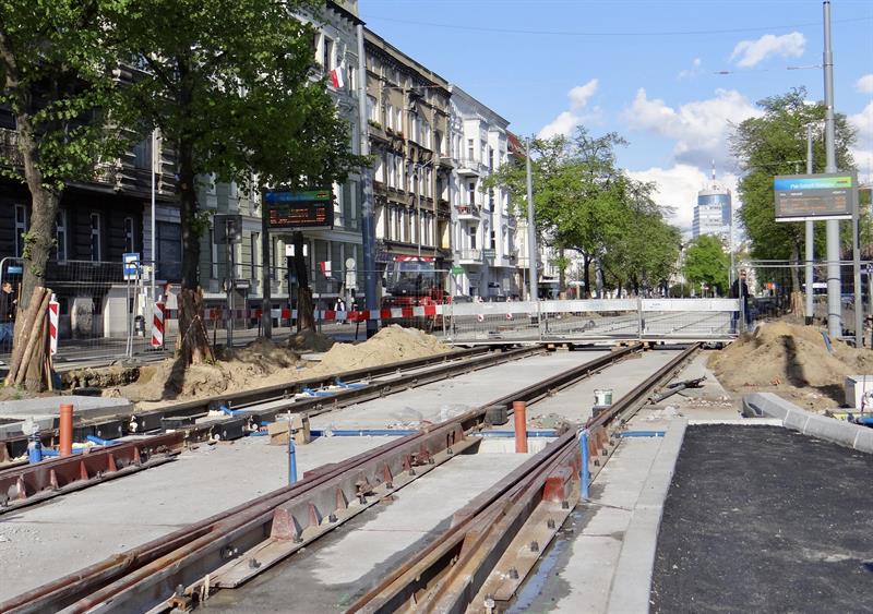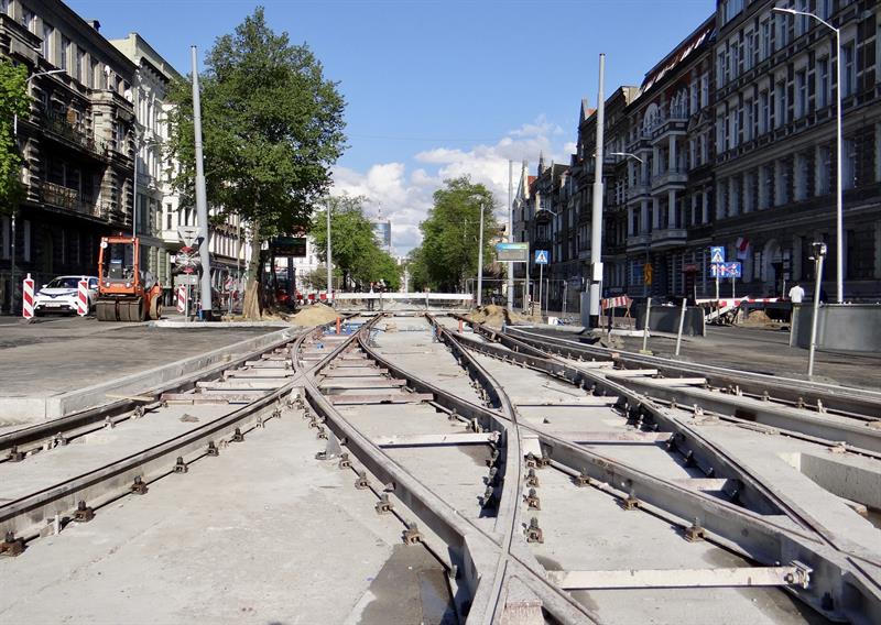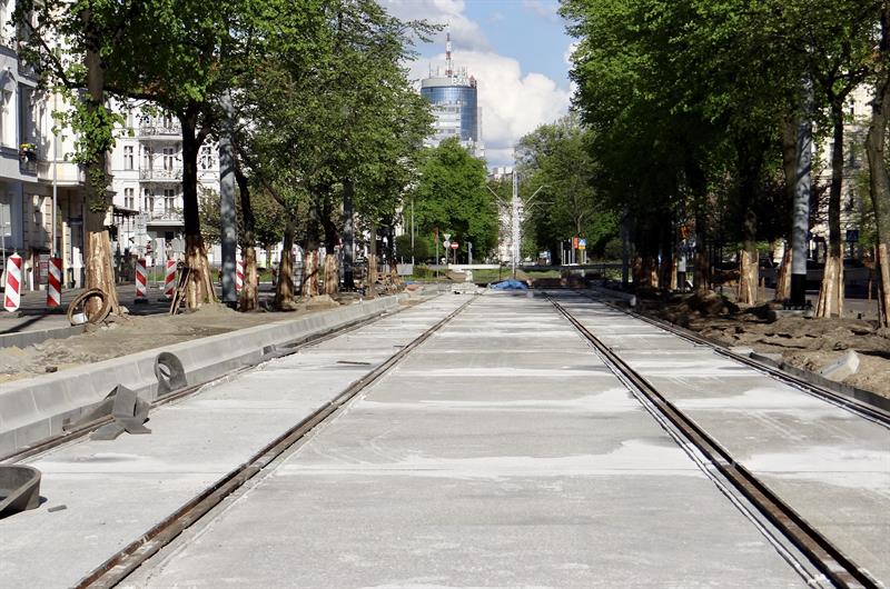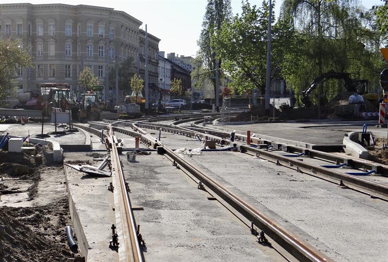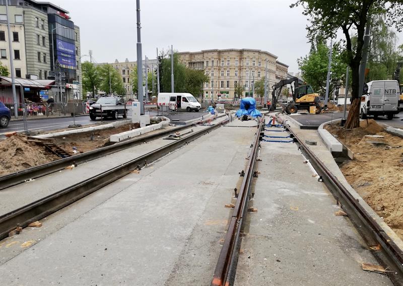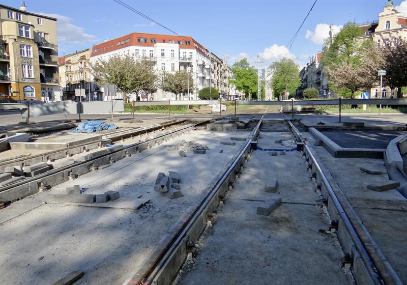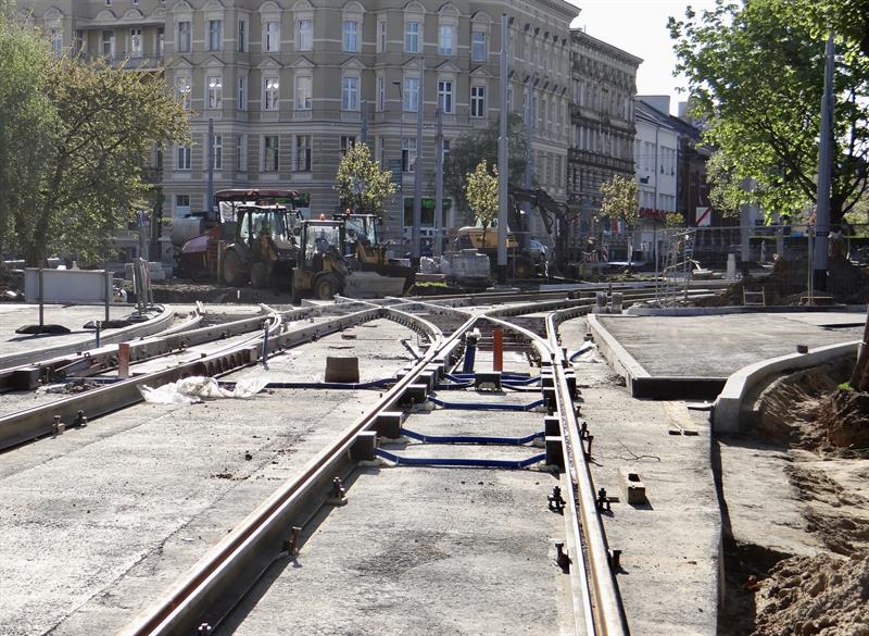 W pasie jezdni wokół wyspy ronda pl. Szarych Szeregów na całej jej szerokości wylana została pierwsza warstwa nowej nawierzchni asfaltowej. To tylko część prac prowadzonych w jego rejonie, a związanych z trwającą przebudową torowiska. W al. Piłsudskiego na odcinku do pl. Odrodzenia zespawane i zamocowane do betonowej płyty fundamentowej podbudowy oba tory w części zostały już zalane kolejną warstwą betonu. A na innych fragmentach trwają jeszcze prace montażowe przed podobną operacją wypełniania międzytorzy.