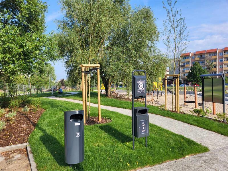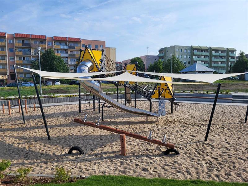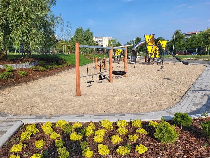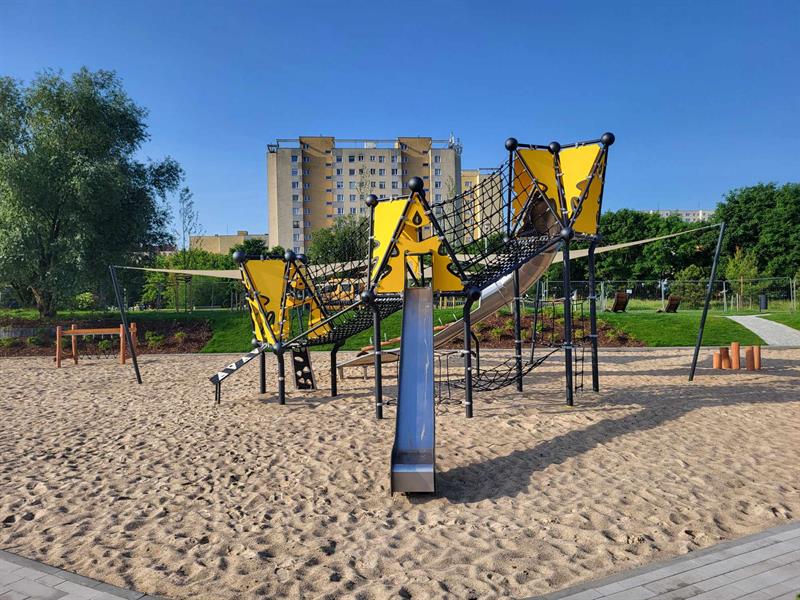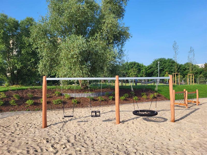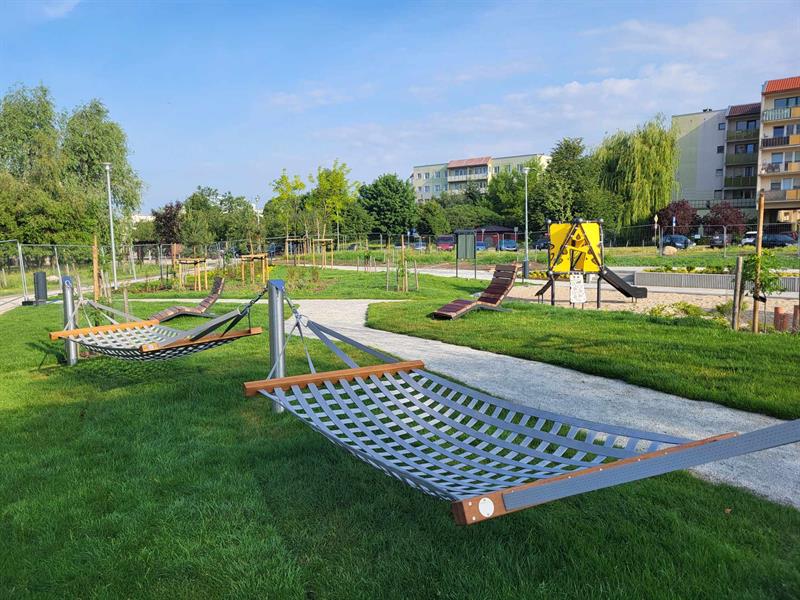 Wokół wytyczono parkowe alejki, zamontowano elementy małej architektury - od rekreacyjnych hamaków po stojaki rowerowe, a cały teren oświetlono. Nowa strefa zabawy i relaksu została zaaranżowana w otoczeniu zieleni. Jednak jej drzewa -wierzby białe, robinie akacjowe, sosny i platan - wciąż młode. Zanim zaczną dawać cień, ochronę przed palącym słońcem dają "żagle", rozpięte ponad niektórymi z urządzeń zabawowych.