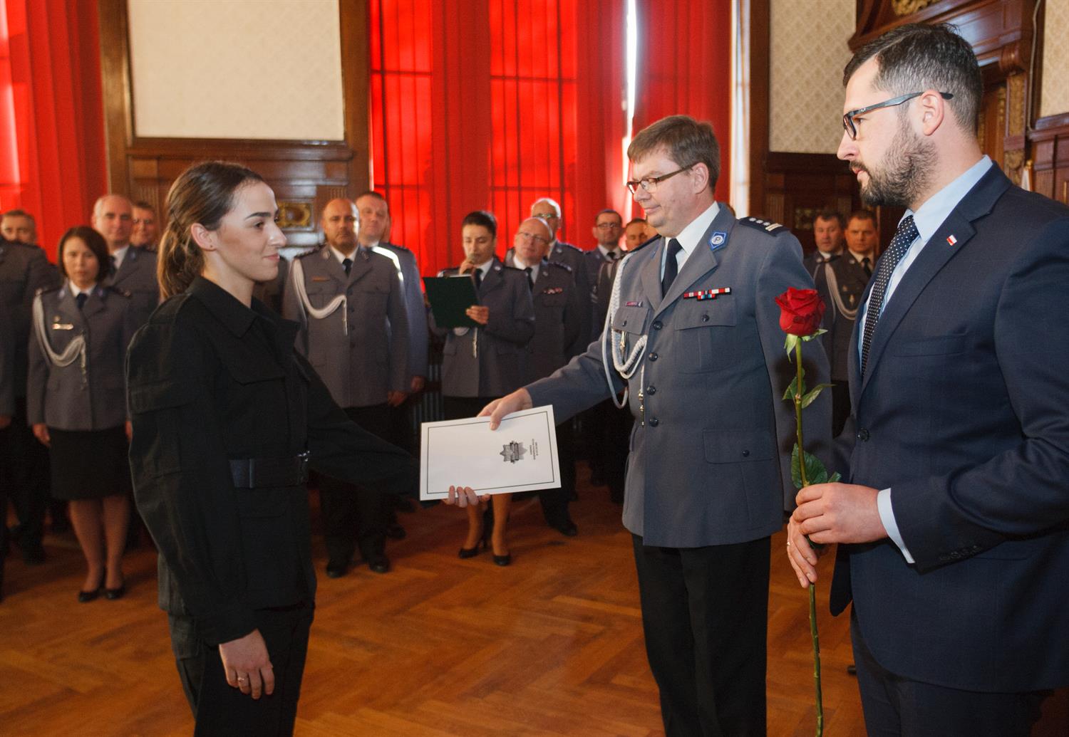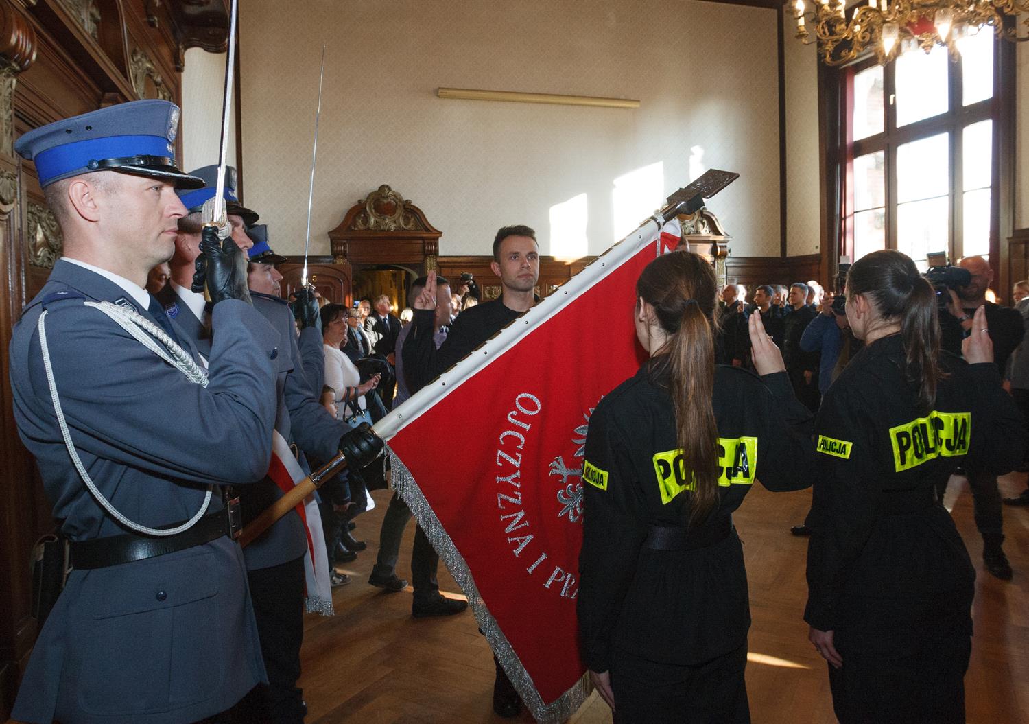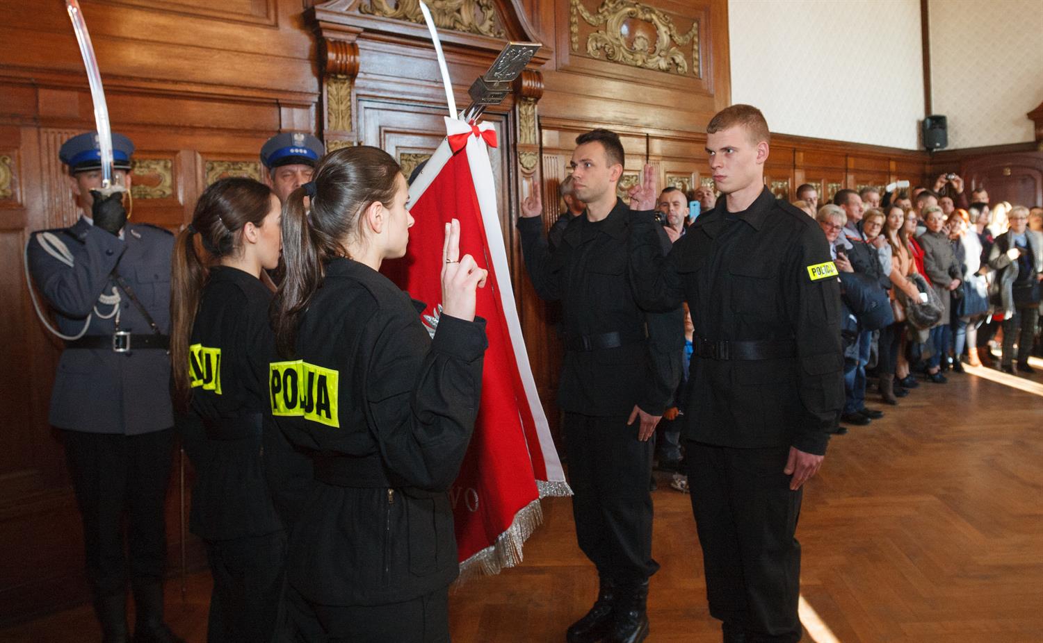 Dwudziestu ośmiu nowych policjantów zachodniopomorskiego garnizonu złożyło w poniedziałek (13 listopada) ślubowanie służenia ojczyźnie i społeczeństwu. Funkcjonariusze wzorowo wykonujący obowiązki służbowe podczas uroczystości w Urzędzie Wojewódzkim otrzymali medale, odznaczenia oraz akty mianowania na wyższe stopnie.