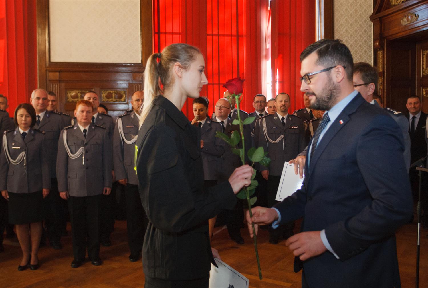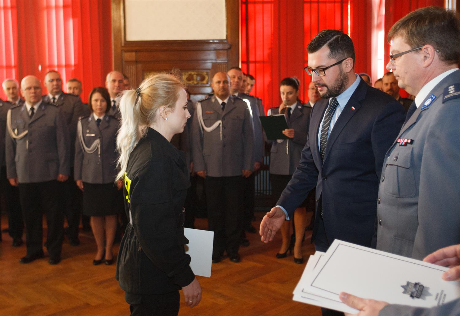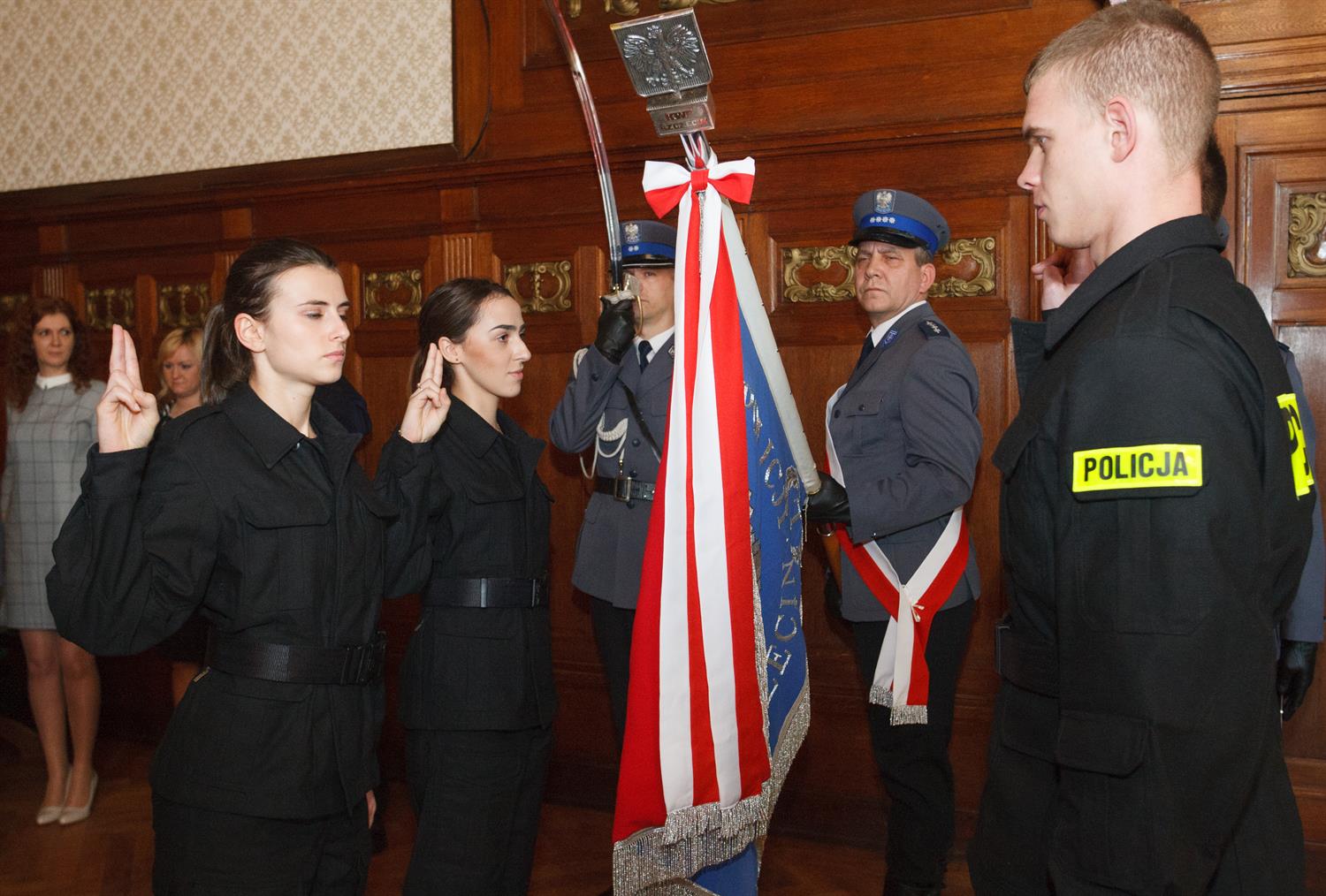 Dwudziestu ośmiu nowych policjantów zachodniopomorskiego garnizonu złożyło w poniedziałek (13 listopada) ślubowanie służenia ojczyźnie i społeczeństwu. Funkcjonariusze wzorowo wykonujący obowiązki służbowe podczas uroczystości w Urzędzie Wojewódzkim otrzymali medale, odznaczenia oraz akty mianowania na wyższe stopnie.