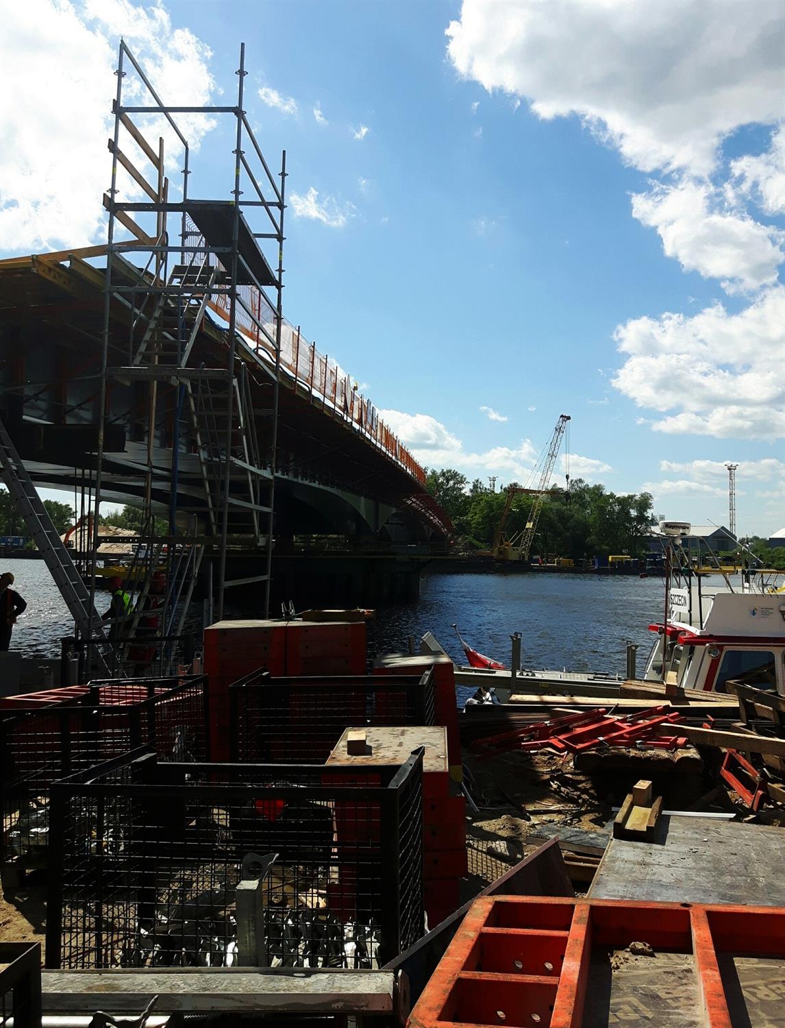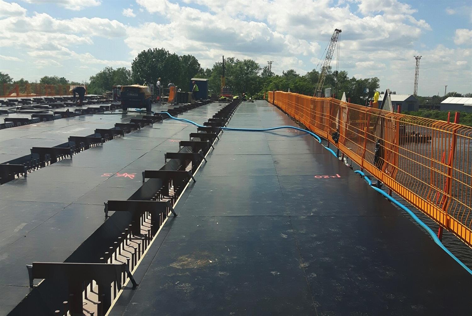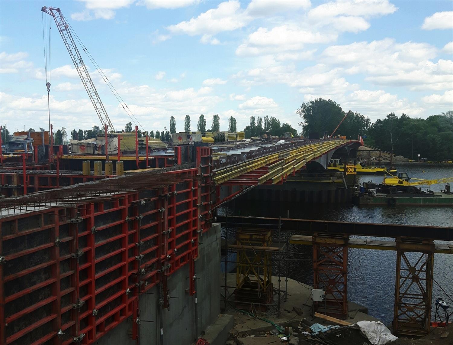 - Wykonany został styk środkowy pomiędzy dwoma częściami konstrukcji - poinformował Szymon Wasilewski, rzecznik prasowy Zarządu Dróg i Transportu Miejskiego. - Obecnie trwa deskowanie i montaż zbrojenia płyty pomostu, która zostanie zespolona z już zamontowaną konstrukcją stalową.