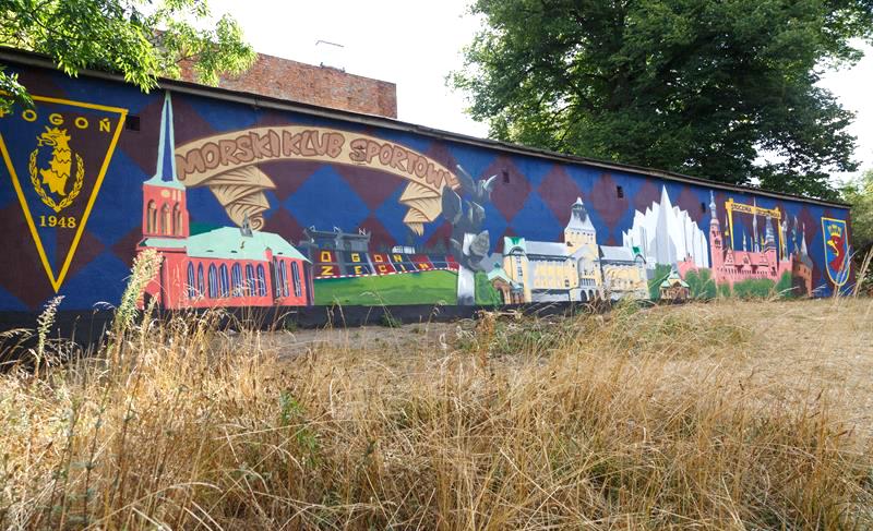 Od blisko dwóch tygodni na ścianie garaży przy ulicach: Gontyny i Jana Chryzostoma Paska w Szczecinie mieszkańcy mogą podziwiać nowy mural. Malowidło przedstawia m.in. stary stadion Pogoni Szczecin z charakterystycznym zadaszeniem oraz najważniejsze zabytki stolicy Pomorza Zachodniego.