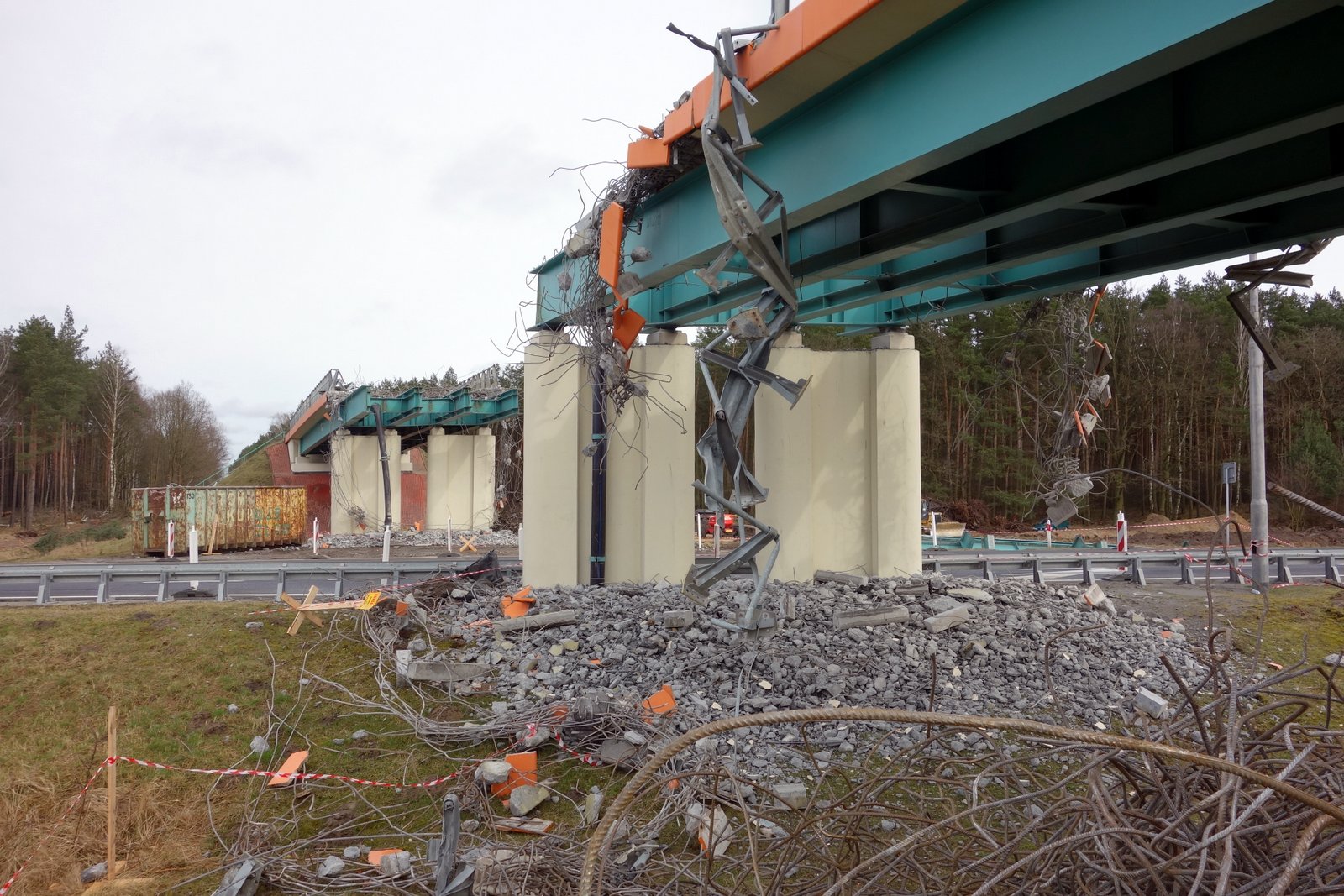 Ekipa zajmująca się rozbiórką w ubiegłym tygodniu przez dwie noce demontowała przęsło wiszące bezpośrednio nad drogą krajową. Na ten czas DK6 na kilkukilometrowym odcinku była zamykana, a cały strumień pojazdów kierowano objazdem przez Goleniów. Obecnie ruch samochodowy odbywa się już normalnie, a do demontażu zostały przęsła na poboczu „szóstki”.