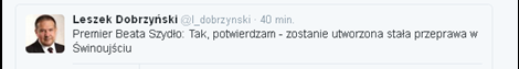 Chwilę przed głosowaniem nad wotum zaufania dla rządu Beaty Szydło, w czasie odpowiedzi na pytania poselskie, pani premier obiecała, że w Świnoujściu powstanie stała przeprawa drogowa.