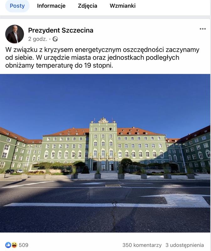 Taka informacja ukazała się w czwartek (22 września) na profilu FB Prezydent Szczecina. Wywołała falę komentarzy - „Co to znaczy jednostkach podlegających? Bo ja bym jednak bardzo prosiła, żeby żłobki i przedszkola zostawić w spokoju”, „A pod biurkiem farelki”, „19 stopni to normalna temperatura, taka temperatura utrzymywana jest w wielu mieszkaniach (tak ustawiane są termoregulatory) i nie jest to jakiekolwiek wyrzeczenie bo tak jest zdrowo”, „Zaraz zaczną się choroby, absencje chorobowe, jak pracować w 19 st?”, „Przyda się trochę chłodniejszego spojrzenia na sprawy choćby komunikacji miejskiej” - piszą internauci.