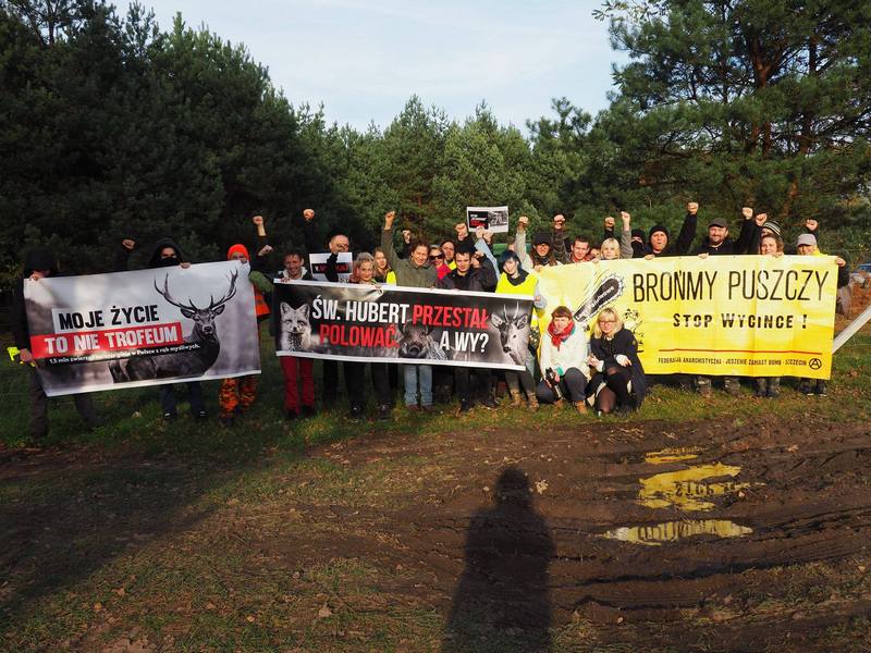Na powitanie myśliwych aktywiści rozwinęli transparenty z hasłami: „Święty Hubert przestał polować a Wy?”, „Piąte: nie zabijaj!”, „Moje życie to nie trofeum”. A następnie ubrani w kamizelki odblaskowe ruszyli w las za myśliwymi, by uniemożliwić im polowanie.