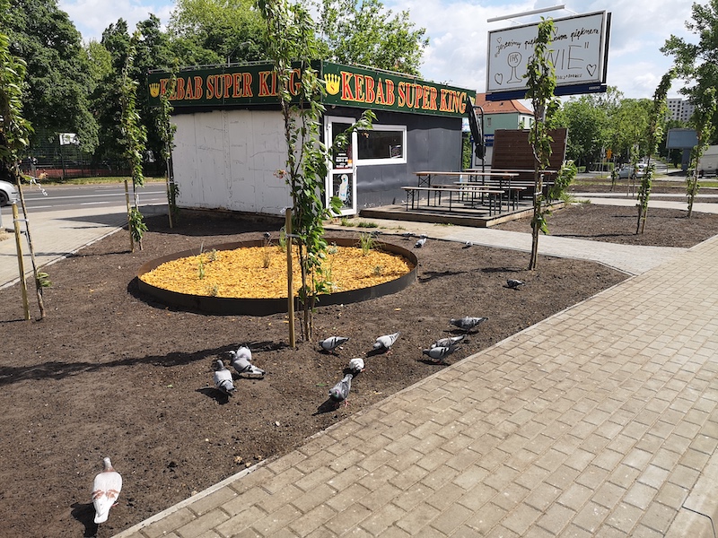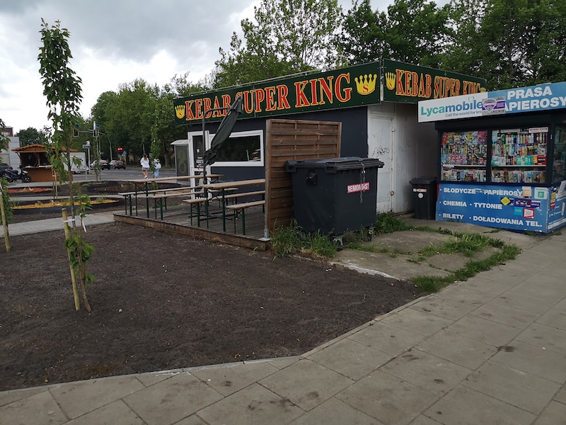Obskurny kebab na nowym zieleńcu na osiedlu Kaliny