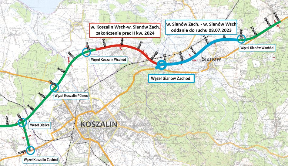 Kierowcy mogą od soboty ominąć miasto po jego północnej stronie korzystając z blisko 5,5 km dwujezdniowej trasy pomiędzy węzłami Sianów Zachód i Sianów Wschód. Obecnie prowadzone są prace przy budowie dalszego odcinka obwodnicy Koszalina i Sianowa, do węzła Koszalin Wschód, który ma być gotowy w przyszłym roku.