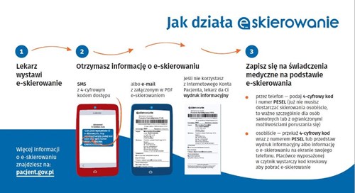 Więcej o zasadach wystawiania e-skierowania, jego zaletach, o tym, jak korzystać z tego dokumentu elektronicznego można przeczytać na portalu: pacjent.gov.pl