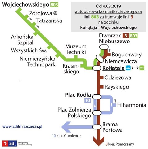 – Do odwołania wstrzymany zostanie ruch tramwajowy na odcinku Kołłątaja – Las Arkoński – informuje Hanna Pieczyńska, rzecznik miasta ds. dróg i transportu miejskiego. – Linia 3 kursować będzie na trasie Dworzec Niebuszewo – Pomorzany wg specjalnego rozkładu jazdy, bez zmiany częstotliwości. Natomiast linia 10 kursować będzie na skróconej trasie Gumieńce – pl. Rodła. Od pl. Żołnierza Polskiego tramwaje pojadą ul. Matejki.