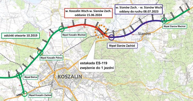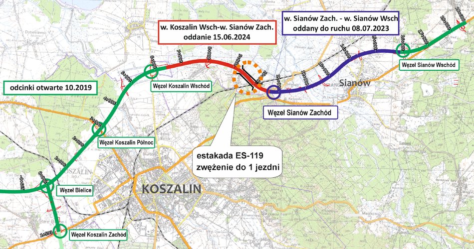 Ostatni blisko 5-kilometrowy fragment obwodnicy, od węzła Koszalin Wschód do węzła Sianów Zachód w sobotę został udostępniony kierowcom. Przejazd samochodów odbywa się jeszcze ze zwężeniem do jednej jezdni na 800-metrowej estakadzie, ale ruch tranzytowy w całości omija już miasto.