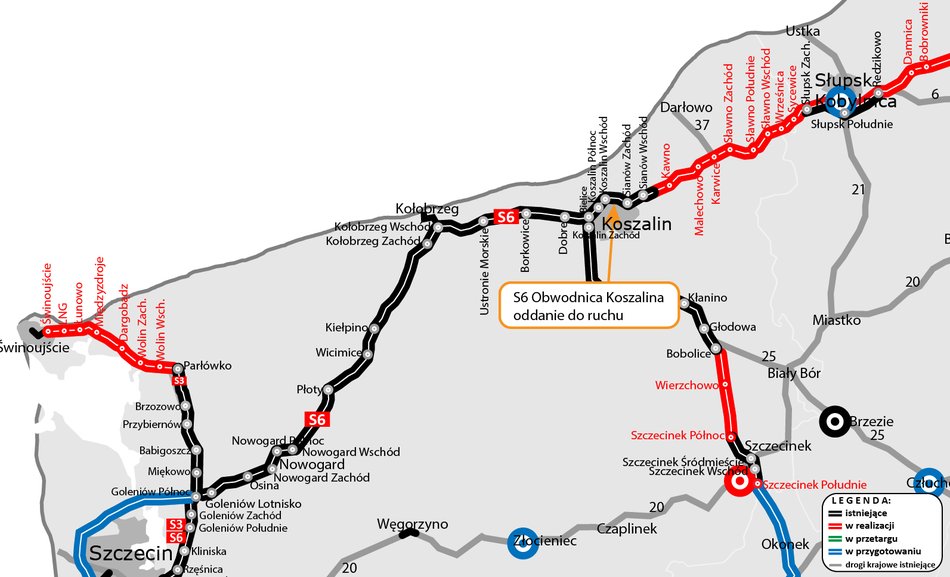 Równocześnie prowadzona jest budowa odcinków S6 w województwie pomorskim. Powstaje tu druga jezdnia obwodnicy Słupska oraz cztery odcinki od Słupska do trasy kaszubskiej.