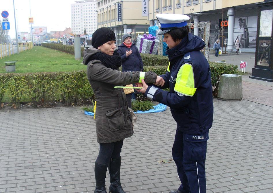 W związku z szybko zapadającym zmrokiem oraz niekorzystną dla niechronionych uczestników ruchu porą roku, policjantki z Wydziału Ruchu Drogowego KMP w Szczecinie rozdawały opaski odblaskowe oraz torby zakupowe z elementami odblaskowymi mieszkańcom Szczecina.