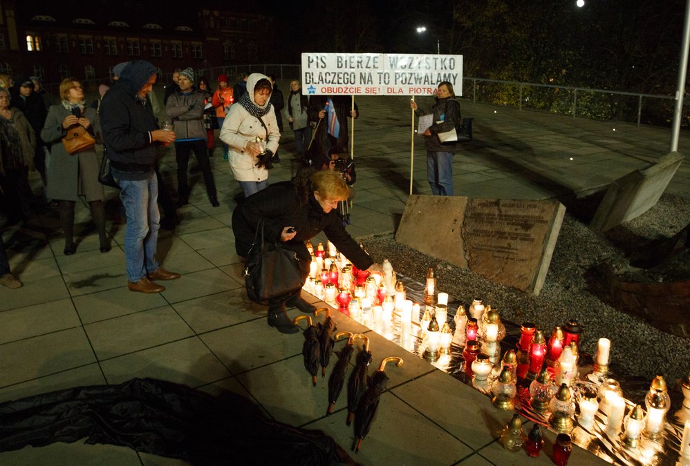 Była to demonstracja pod hasłem: "Obudźcie się za głosem Szarego Człowieka". Część osób przyszła ze zniczami, które stawiano pod pomnikiem. Ta też ustawiono zdjęcia zmarłego Piotra Szczęsnego. Za pomnikiem z kolei wywieszono kolejne punkty z jego protestu - w języku polskim i angielskim.