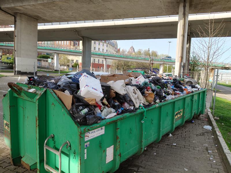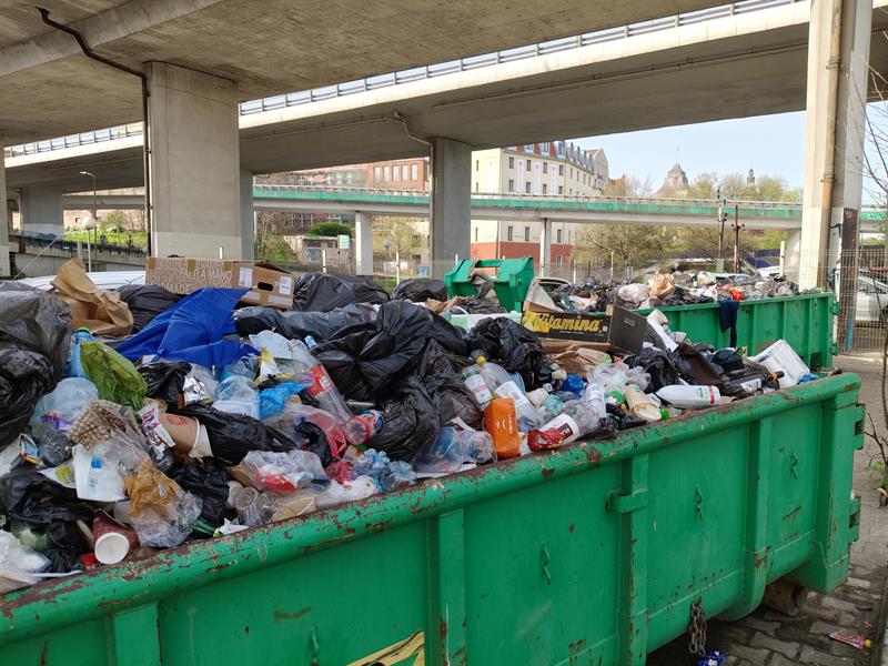 To nie jest zaplecze budowy. W kontenerach widać jedynie typowo domowe śmieci, a nie budowlane odpady. Wielkie stalowe kontenery są nimi przepełnione, a że źle zabezpieczone, to śmieci z nich się przelewają. Na dodatek gniją i cuchną okropnie, że przejść przy nich trudno. Choć trzeba, bo właśnie w ich bliskości prowadzi zarówno szlak od Zamku Książąt Pomorskich na Wały Chrobrego, a też na Podzamcze i dalej - na nadodrzańskie bulwary oraz Łaszownię.