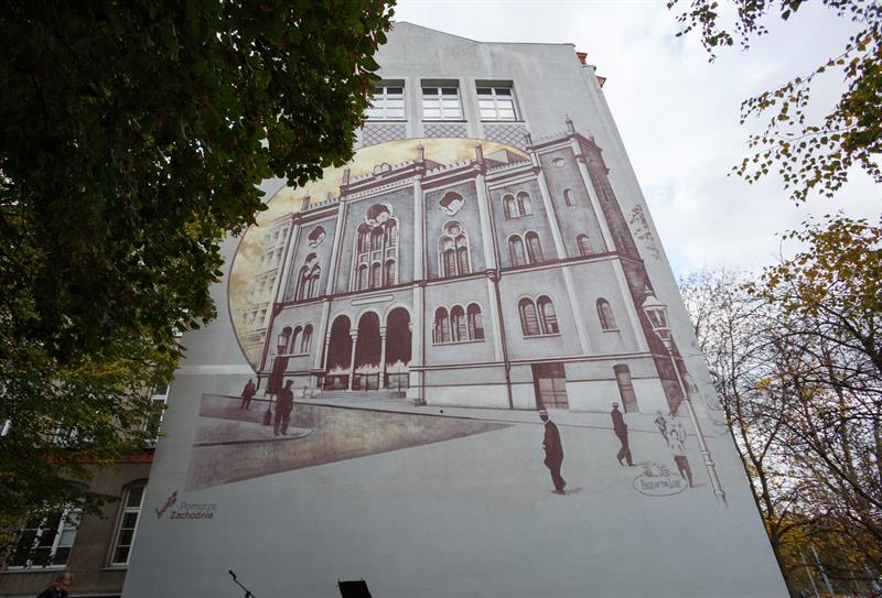 Odsłonięcie muralu, którego autorem jest znany uliczny artysta Piotr Pauk (znany jako "Lump") odbyło się w czwartek 10 listopada o godzinie 14. Była to oficjalna prezentacja dzieła, które przedstawia budynek dawnej, zniszczonej w trakcie Nocy Kryształowej (z 9 na 10 listopada 1938 roku) synagogi. W wydarzeniu udział wzięli miedzy innymi: członkowie Towarzystwa Społeczno-Kulturalnego Żydów, naczelny rabin Polski Michael Schudrich, marszałek województwa zachodniopomorskiego Olgierd Geblewicz oraz wojewoda zachodniopomorski Zbigniew Bogucki.