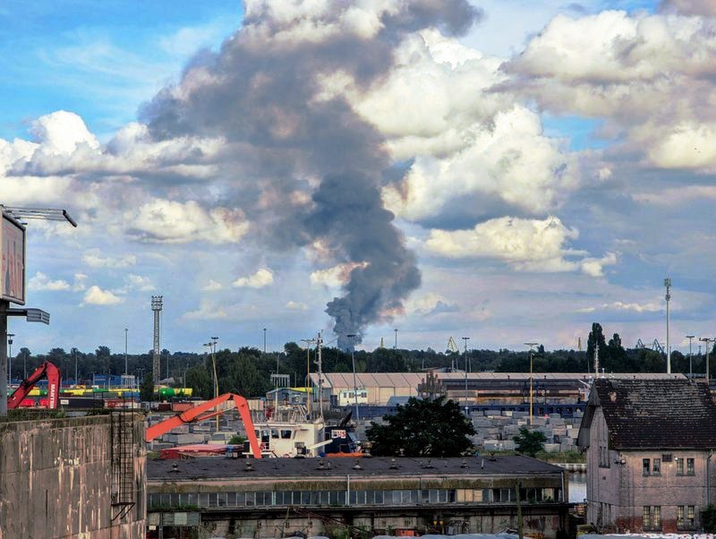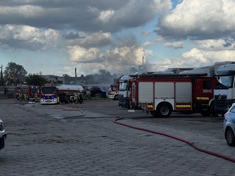 Pożar wybuchł w czwartek około godz. 17 na terenie zakładu wulkanizacyjnego przy ul. Pomorskiej w Szczecinie. Wysoki słup dymu jest widoczny z dużej odległości.