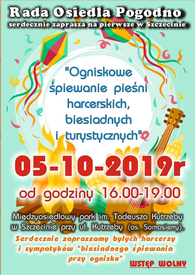 Obecnych i byłych harcerzy oraz sympatyków biesiadnego śpiewania Rada Osiedla Pogodno zaprasza na pierwsze w Szczecinie „Ogniskowe śpiewanie pieśni harcerskich, biesiadnych i turystycznych".