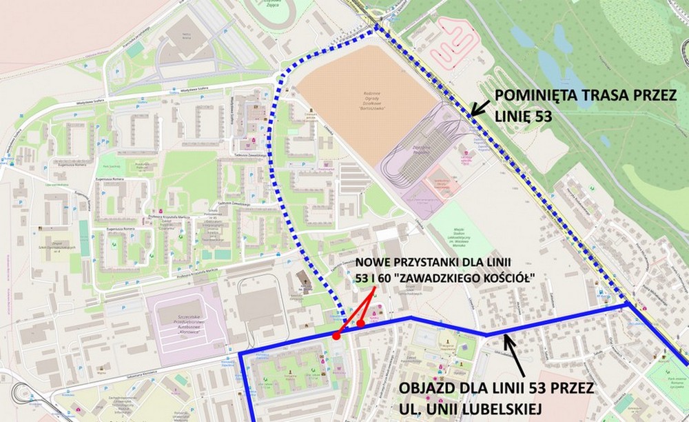 Linia nr 53 – od 8 marca kursować będzie objazdem. Autobusy będą pomijać ulice Zawadzkiego, Szafera oraz Al. Wojska Polskiego do skrzyżowania z Unii Lubelskiej. W okresie objazdu zawieszone zostaną przystanki: Zawadzkiego Kościół (na ul. Zawadzkiego), Zawadzkiego, Zajezdnia Pogodno. Wyznaczony zostanie dodatkowy przystanek „Zawadzkiego Kościół” na ul. Klonowica przy skrzyżowaniu ulic Zawadzkiego, Klonowica, Janickiego – na dodatkowym przystanku zatrzymywać będzie się linia nr 60.