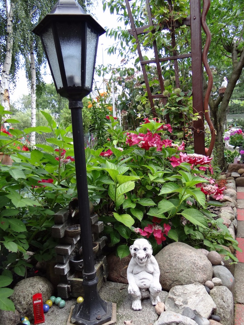 Pan Jan, z pokolenia, o którym często zwykło się mówić, że potrafią zrobić coś z niczego, czyli złota rączka, oprowadza po ścieżkach wijących się wśród perfekcyjnie przystrzyżonego trawnika, a obok formowanych w geometryczne kształty bukszpanów i żywotników ciętych w stylu bonsai. To szlak wyłożony czerwonymi płytkami (celowe nawiązanie do nazwy ulicy, przy której powstał ogród), który wiedzie ku różnorodnym postaciom: skrzatom, słomianym cudakom, motylom, trolom, smerfom, smokom, krokodylom, ale też ku ogrodowym storczykom, bodziszkom, barwinkom, do rojnikowych i rozchodnikowych kobierców, kęp kolekcjonerskich okazów żurawek. I ku stawikowi z fontanną, i wspomnianą wyspą skarbów , nabrzeżem z migocących kamieni, szkieł i korali. Skąd... płynie promień morskiej latarni. Cumuje tu też okręt ze smurfową orkiestrą na pokładzie, a sympatyczną współlokatorką domowników w ogrodzie jest od jakiegoś czasu ropucha. Z tą ostatnią pan Jan tak się zaprzyjaźnił, że urządził dla niej specjalnym pomościk, by ułatwić płazowi wychodzenie z wody na spacery w cieniu roślin.