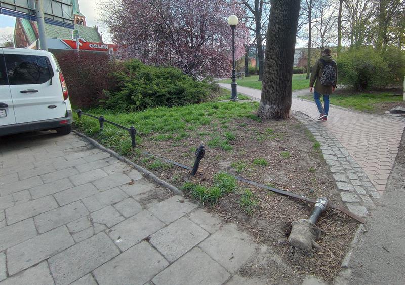 Szeroki chodnik przy ul. Kopernika - tuż przy skwerze Ackermanna - zwykle zawłaszczają parkujące samochody. Niszcząc nie tylko jego nawierzchnię, ale również uszkadzając stylizowane żeliwne ogrodzenie trawnika. Jeden z jego odcinków (na zdjęciu) właśnie "poległ" pod naporem kół pewnego SUVa. Oby miejskie służby zdążyły z naprawą ogrodzenia przed złomiarzami. Bo bez niego... Zniknie ostatni bastion broniący zieleń Ackermanna przed autami.