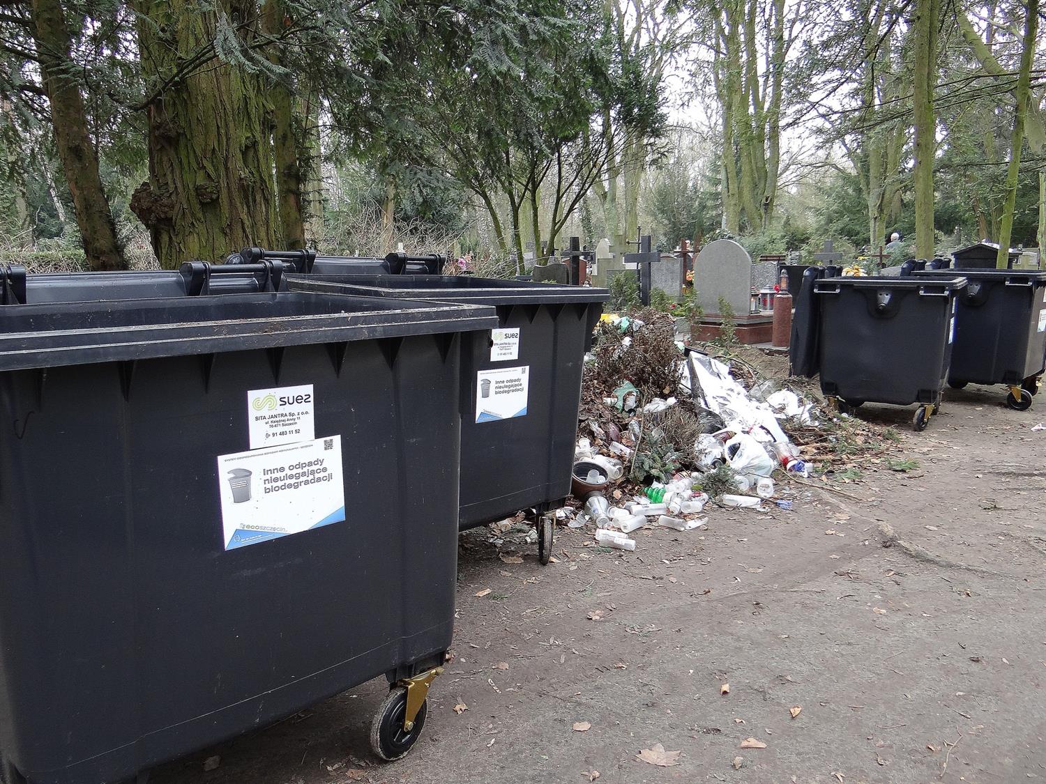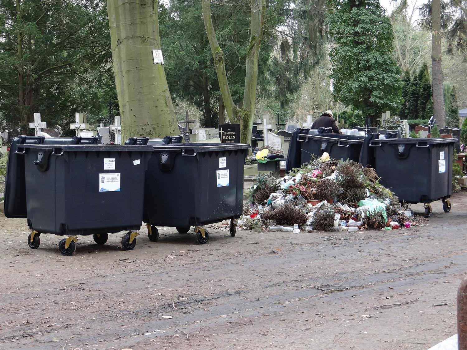 Niedawno z Cmentarza Centralnego zostały usunięte zielone kontenery oraz wykonane ze stalowych prętów pojemniki na odpady. Następnie ktoś wpadł na kolejny „wspaniały" pomysł i alejki cmentarza zostały gęsto upstrzone okropnymi czarnymi wielkimi kontenerami na śmieci niebiodegradowalne (że użyję tego trudnego słowa).