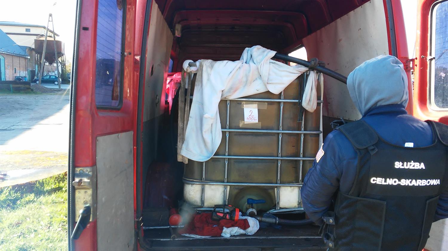 Podczas kontroli drogowej samochodu dostawczego funkcjonariusze Służby Celno-Skarbowej i policji znaleźli w nim dwa pojemniki Mauser. Zawierały 1450 litrów oleju żeglugowego.