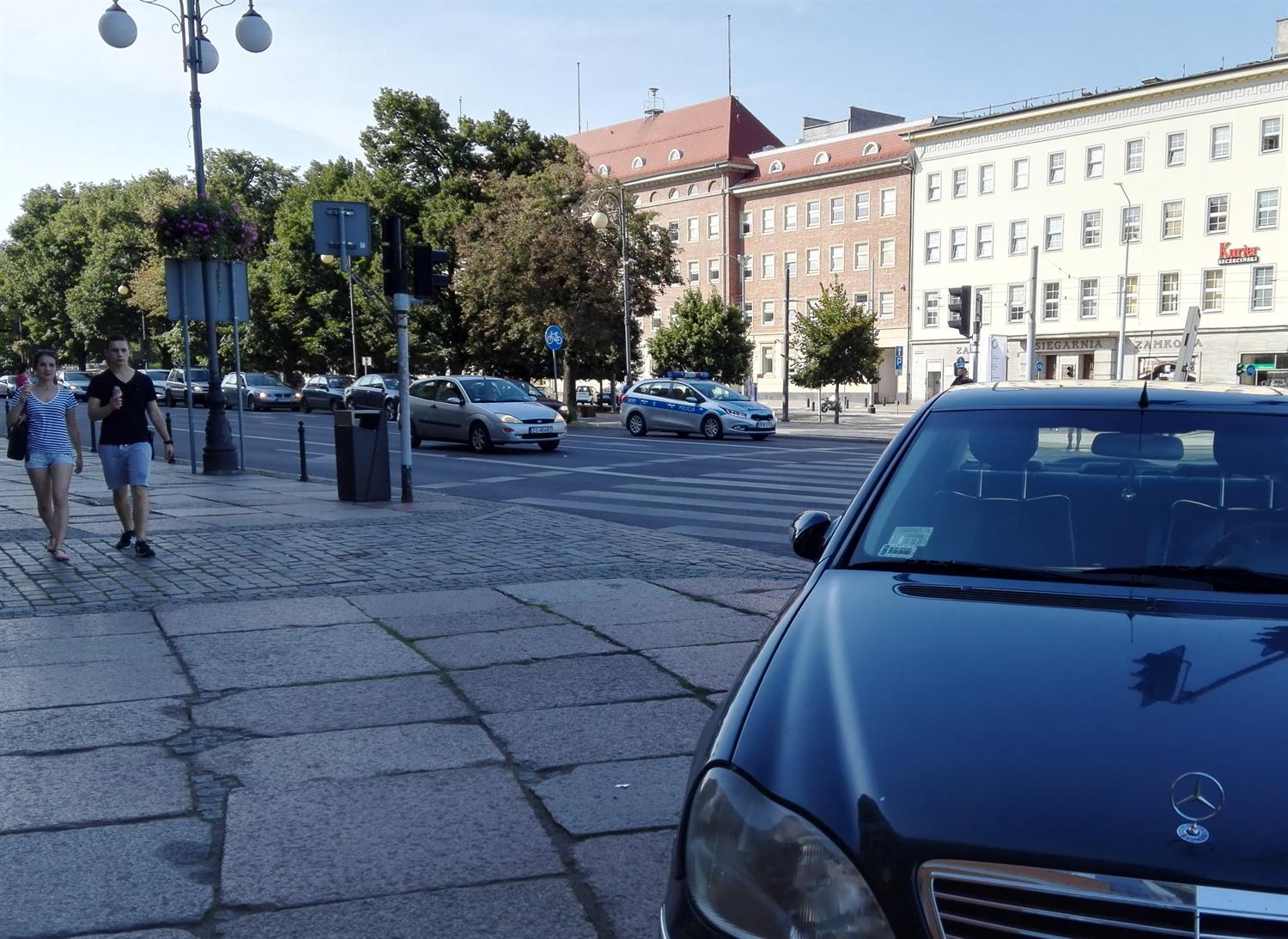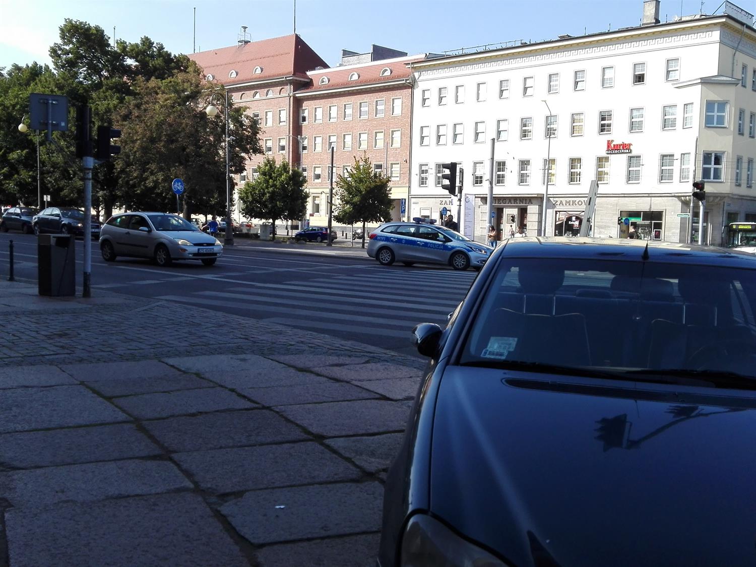 Tak nawet - jak widać na zdjęciu nadesłanym przez Czytelnika - na pl. Żołnierza Polskiego, gdzie natężenie ulicznego ruchu ogromne, a też skąd widać gmach Komendy Wojewódzkiej Policji w Szczecinie. W tle tak właśnie parkującego samochodu bohaterowie drugiego planu: zmotoryzowany patrol naszej dzielnej policji.