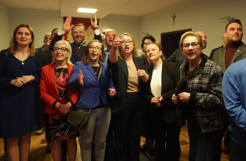 Nastroje w sztabie Prawa i Sprawiedliwości są bardzo optymistyczne po ogłoszeniu wyników. – Zbyszek! Zbyszek! – skandują politycy partii na część Zbigniewa Boguckiego.